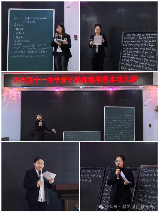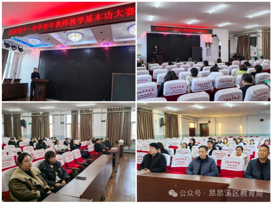 比赛前,教务处主任带领几位成员精心设计比赛流程,细心组织专业评委,用心准备比赛用品。参赛青年教师准备充分。从现场抽取题签到备课再到现场展示,只有短短20分钟时间,但是数学组刘鸿建老师、英语组姜来老师、英语组王玲老师、数学组马文婷老师、英语组郭亚双老师都展现出了极强的教学功底,语言表达精准,学科特色鲜明,临场表现自信,以昂扬的精神、饱满的激情逐一惊艳亮相,将个人风采与综合素养表现得淋漓尽致!比赛结束后,教学副校长做了总结发言“本次比赛是对学校青年教师基本功的一次全面考察,也是为青年教师搭建切磋技艺、展示风采、实现自我发展的平台,指引青年教师自觉学习,快速成长。在接下来的赛程里,希望有更多青年教师能够在讲台上闪耀光芒,为十一中教育的星空增添更多的璀璨与光彩!本次青年教师基本功大赛,进一步加强了青年教师业务基本技能的锻炼,提高了青年教师业务水平,同时也营造了一个相互学习、相互交流、相互促进的良好氛围,基本功训练是一场永远不会落幕的戏,在这样的舞台上,一群青年教师正逐梦远方,绽放最美的芳华!