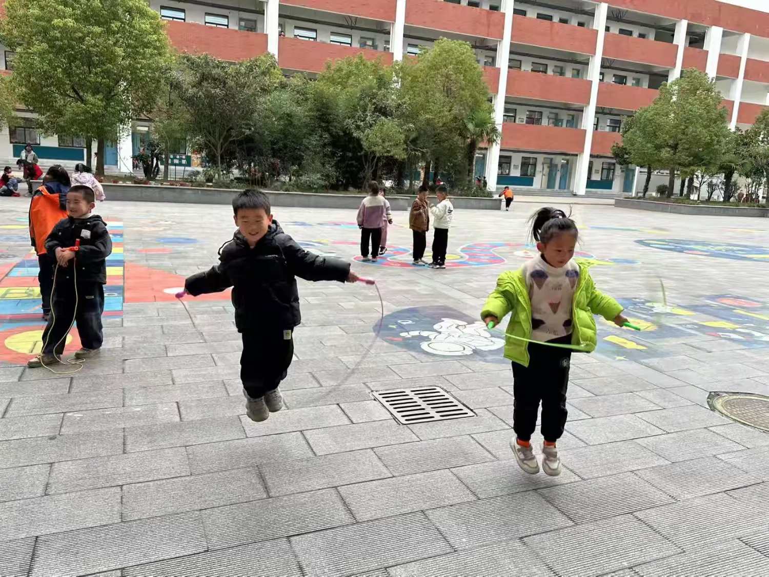 下课了,一年级的小朋友们涌出教室开始了自由的跳绳活动。随着绳子的舞动他们有节奏的跳跃着,灿烂的笑容在他们脸上漾开,多开心呀!在运动中孩子们更加活泼,更加开朗了。