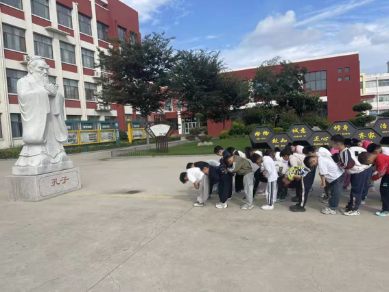 在“一朝沐杏雨,一生念师恩”的颂歌里,拜师礼温情上演。先向孔子行礼,再向自己的老师行礼。孩子们用稚拙而庄重的揖礼,表达对师者的崇高敬意。这一刻,传统文化的薪火在躬身与搀扶间完成传承,知书明理的种子已在童心生根发芽。
