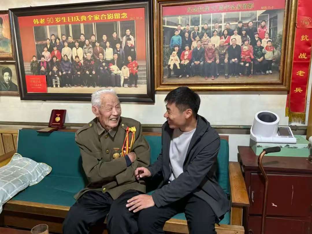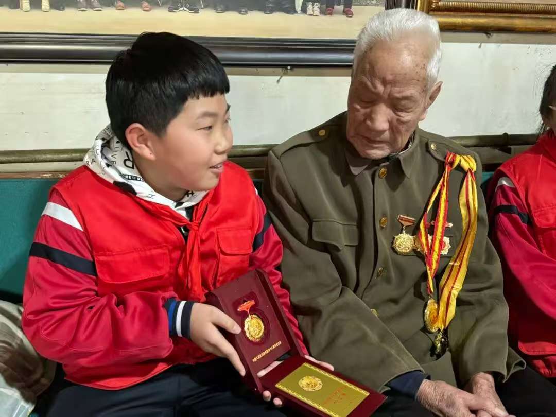 重阳节当天,在刘校长的带领下,少先队辅导员张老师和少先队员代表,带着精心准备的慰问品和节日祝福,来到老兵家中。得知师生们前来,98岁的韩爷爷特意换上整洁的衣物,胸前的三枚荣誉勋章在阳光下熠熠生辉。