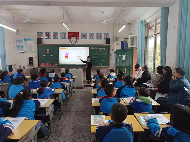 课堂上,三科教学各展亮点:数学课上,吴春杏老师以“分竹笋”谜题引导学生动手操作、梳理除法逻辑,25分钟讲授后,学生自主探索氛围浓厚;语文课上,田雪琴老师以《坐井观天》设问,通过“预学初读、共学辩论、展学表演”让80%以上学生主动开口,当堂检测反馈良好;英语课上,李文俊老师打造“Peppa Pig派对”场景,以任务驱动学生认单词、组对话、演情景剧,让知识学习鲜活高效。