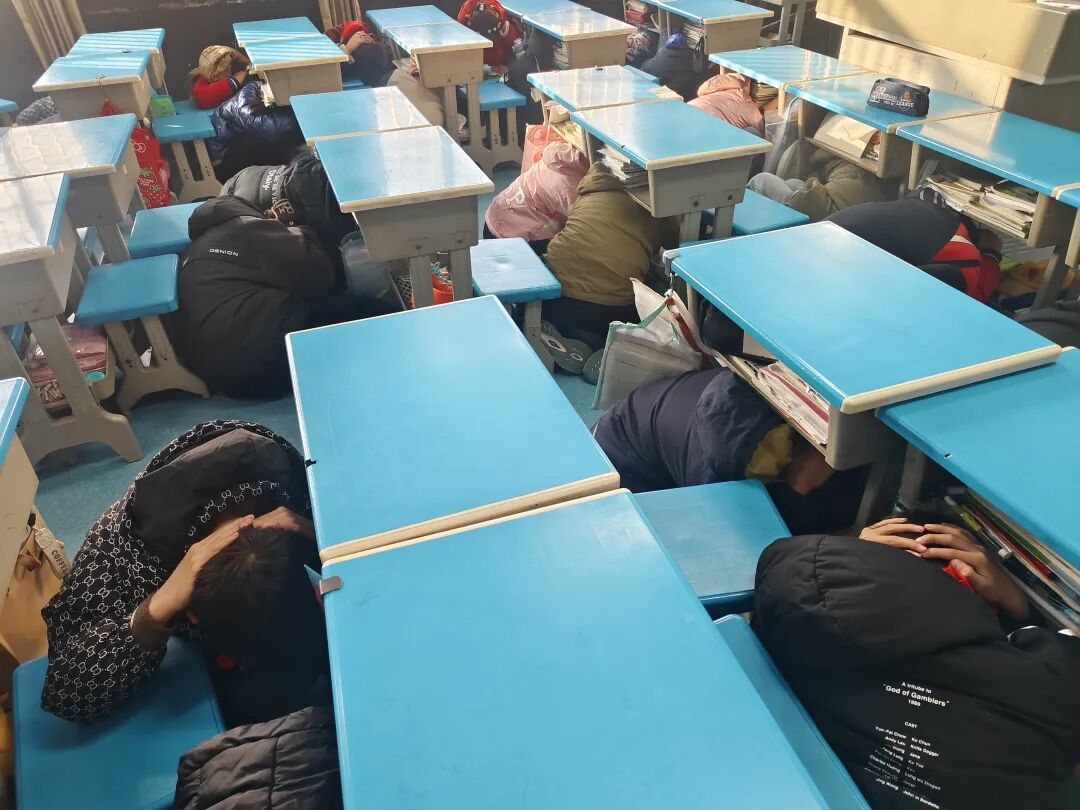 随着演练信号响起,教师立即组织学生开展室内避险。同学们迅速钻到课桌下方,双手护头,保持安静,整个过程井然有序。课桌下形成的狭小三角空间,为模拟地震中的安全避险提供了有效的保护。