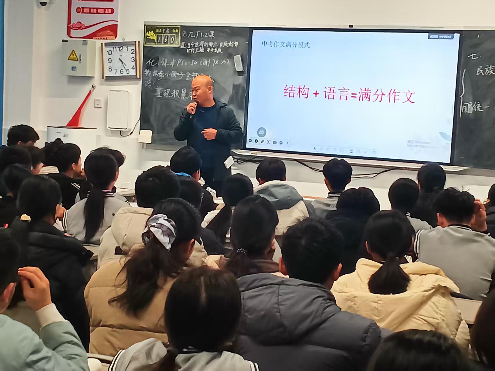 据了解,讲座内容围绕“中考作文满分模式”逐步展开。郝正波老师指出:中考作文要想得高分,甚至满分,必须具备两个条件:结构技巧和语言表达。在讲述结构技巧时,郝正波老师从“排比式结构”“并列式结构”“递进式结构”“蒙太奇式结构”“书信式结构”中,重点讲述了“并列式结构”的表达技巧,结合例文给学生分析并列式结构技巧的形成思路,以及组织语言的常见几种方式:……是……,……有……,……成为……。