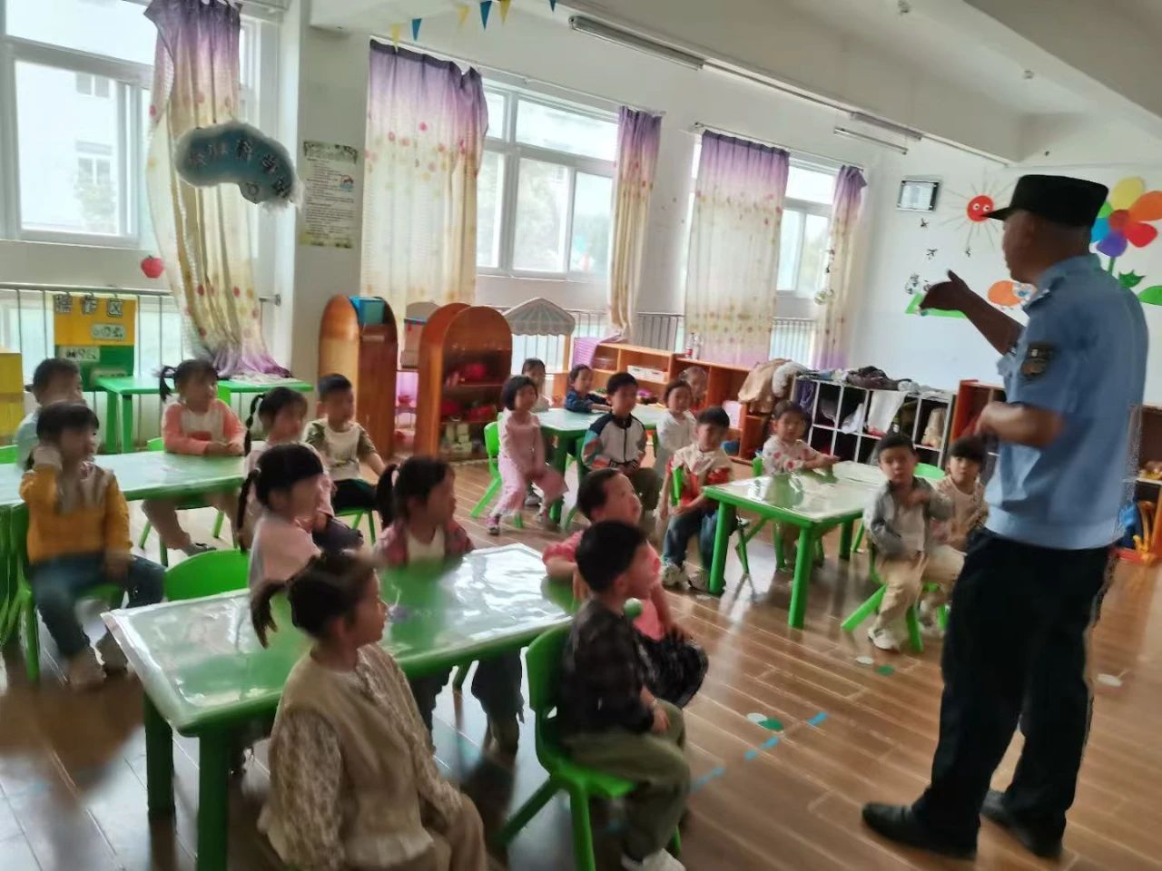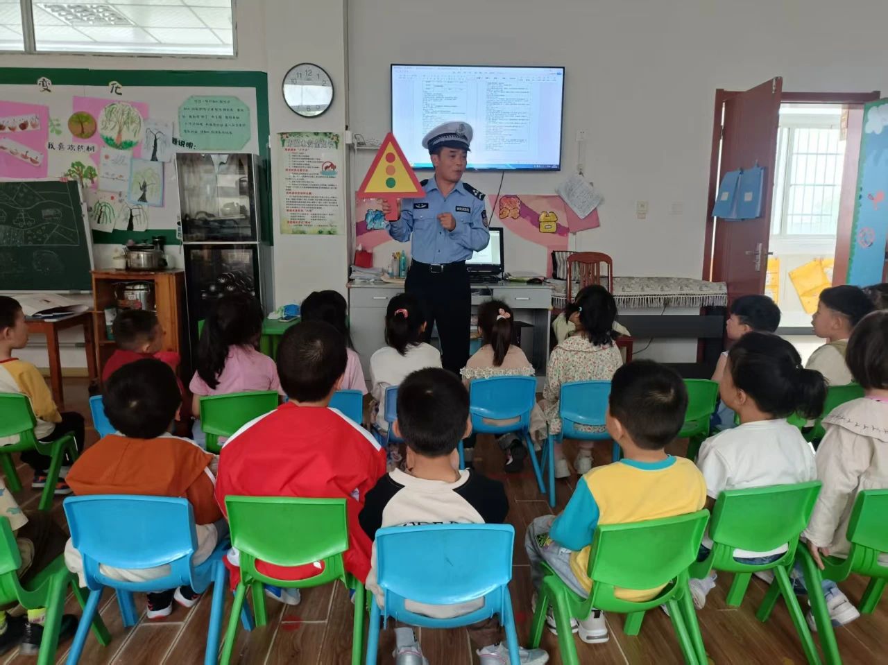 活动中,民警叔叔身穿笔挺的警服,一走进教室就吸引了孩子们好奇的目光。他亲切地和孩子们打招呼,瞬间拉近了与孩子们的距离。在交通安全知识讲解环节,民警叔叔通过播放动画视频、展示交通标志图片等孩子们喜闻乐见的方式,向孩子们讲解了基本的交通规则。他用生动形象的语言告诉孩子们过马路要走斑马线、红灯停绿灯行、不在马路上追逐打闹。还模拟交通场景,邀请孩子们上台扮演“小交警”“行人”“司机”,让孩子们在游戏中加深对交通规则的理解和记忆。孩子们积极参与,现场气氛十分活跃。随后,民警叔叔围绕防溺水安全展开讲解,通过一个个真实的案例,向孩子们讲述了溺水的严重危害。在防拐骗安全教育环节,民警叔叔化身“安全守护者”,通过情景模拟和互动问答,帮助孩子们识破拐骗“陷阱”。