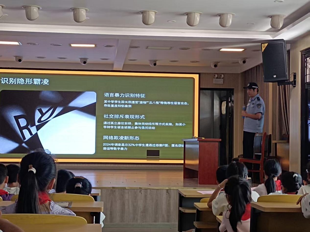活动伊始,该校负责人强调了开展法治宣传教育活动的意义,并结合学生的年龄特点和认知水平,以通俗易懂的语言、生动鲜活的案例,深入浅出地讲解了与未成年人息息相关的《未成年人保护法》《预防未成年人犯罪法》,让学生们明白自己享有的权利和应履行的义务,引导学生从小树立法制观念。随后,泥溪镇派出所罗警官围绕网络安全、防欺凌、交通安全等方面进行了精彩讲座。针对网络安全问题,罗警官详细介绍了常见的网络诈骗手段,如网络刷单、冒充公检法诈骗、网络游戏装备诈骗等。针对校园欺凌,罗警官深入分析了其表现形式、危害后果以及应对方法,教育学生要坚决抵制校园欺凌行为。交通安全方面,罗警官详细讲解了学生日常出行中需要遵守的交通规则等。