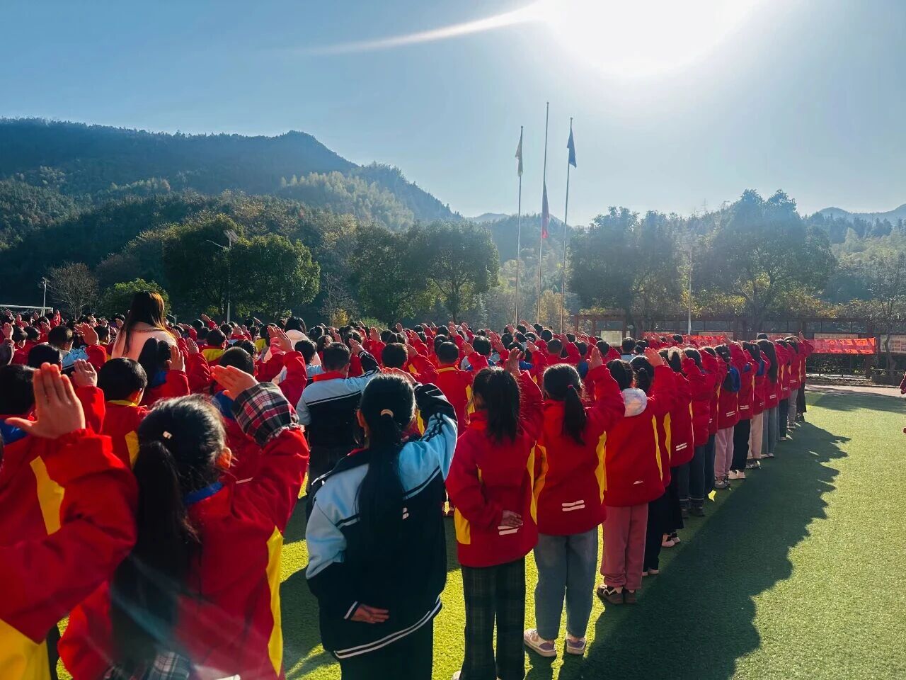升旗仪式上,学生代表以《普法与心,守法于行》为题发表国旗下讲话,呼吁全体同学将宪法精神内化于心、外化于行。