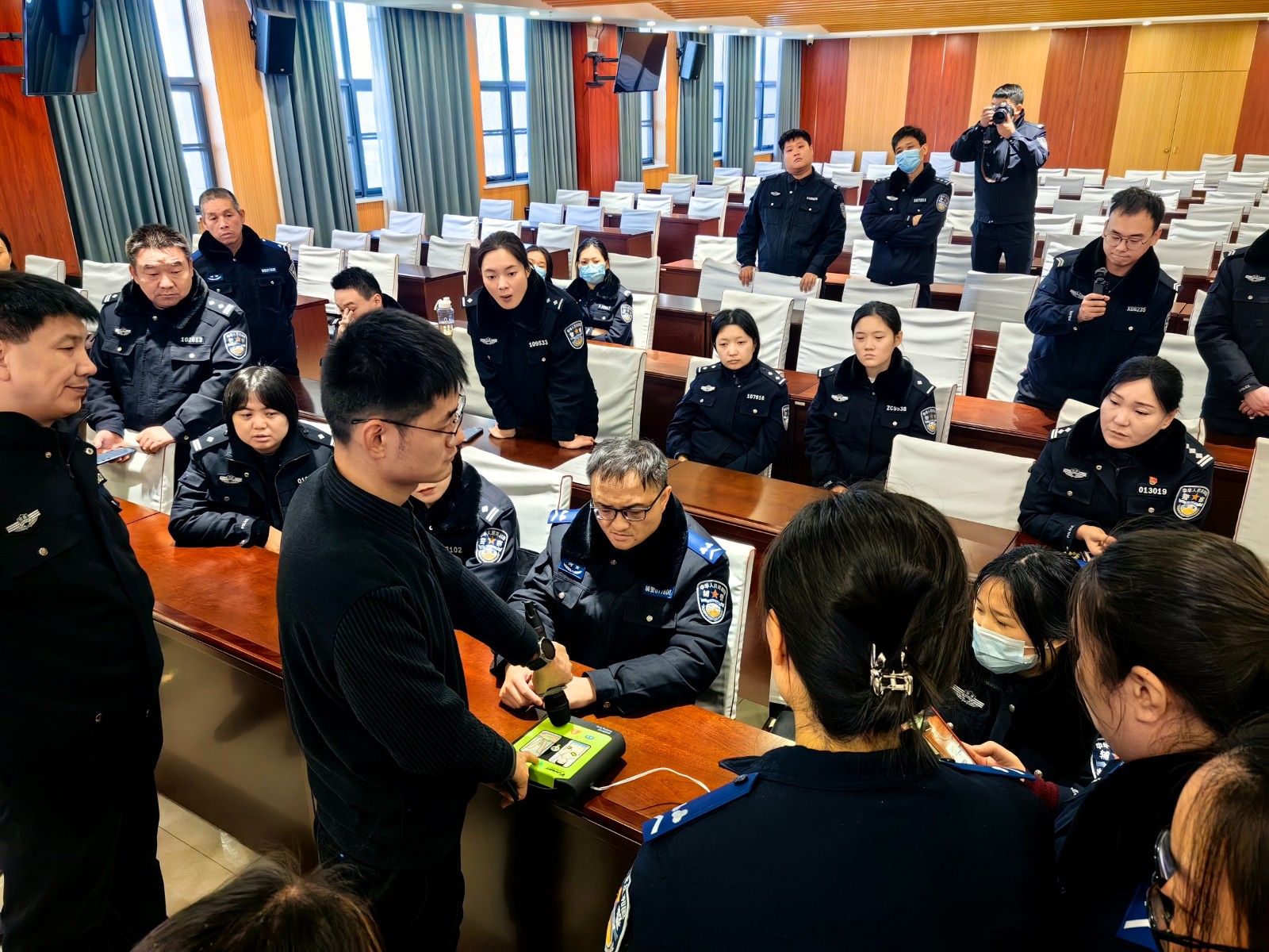 为进一步提升公安队伍应急救援能力,科学有效处置突发意外事件,更好守护民辅警和人民群众生命健康安全,12月6日,在河南省郑州市关心下一代工作委员会牛振西工作室和郑州市金水区红十字会指导下,中鹏工程咨询有限公司向郑州市公安局惠济分局捐赠了6套AED设备,郑州市红十字水上义务救援队联合河南肆分钟教育教育科技有限公司正式开启了“关爱民警,情系警营”应急救护培训活动,当天分局各单位民辅警代表60余人参加培训。