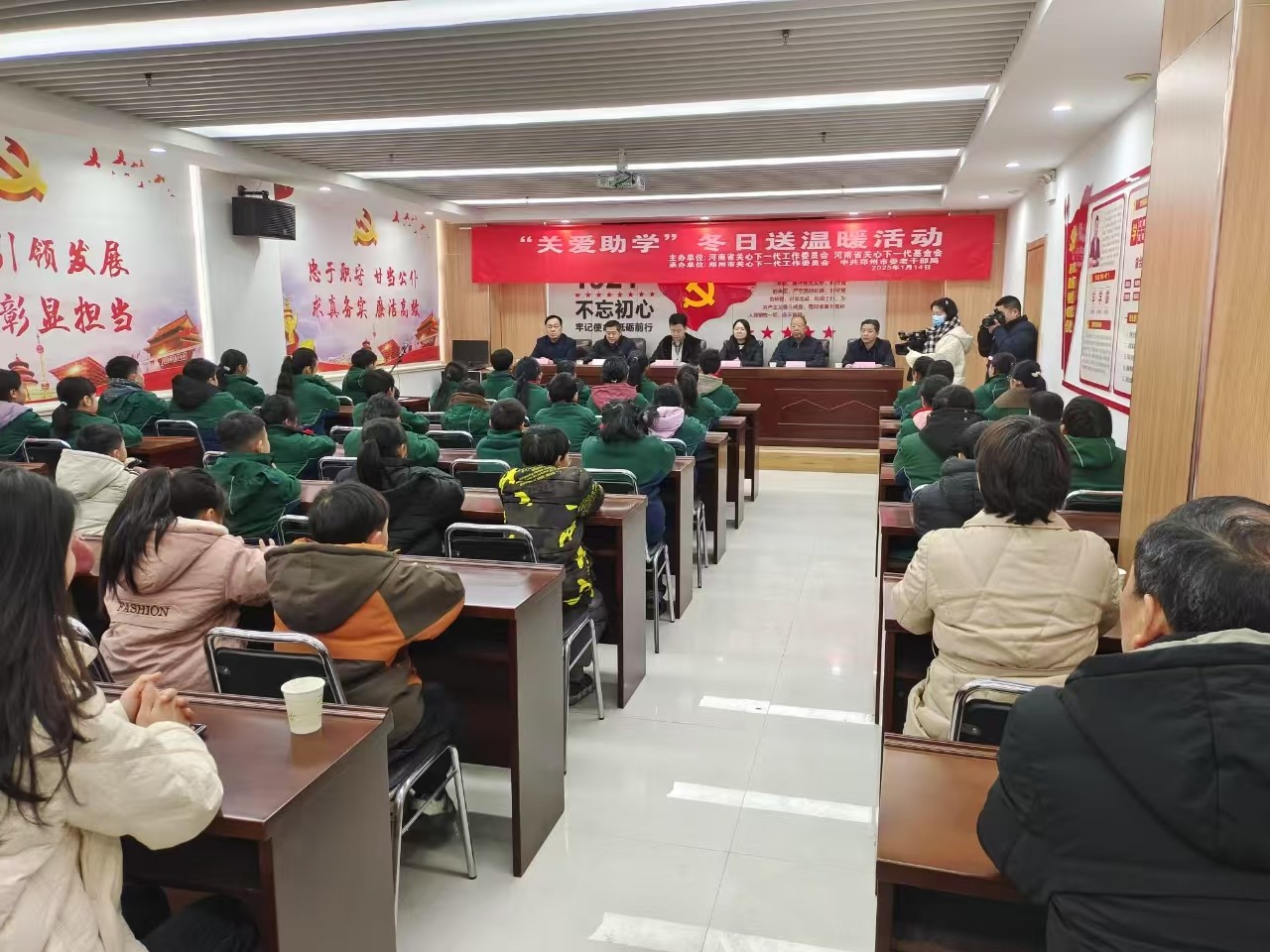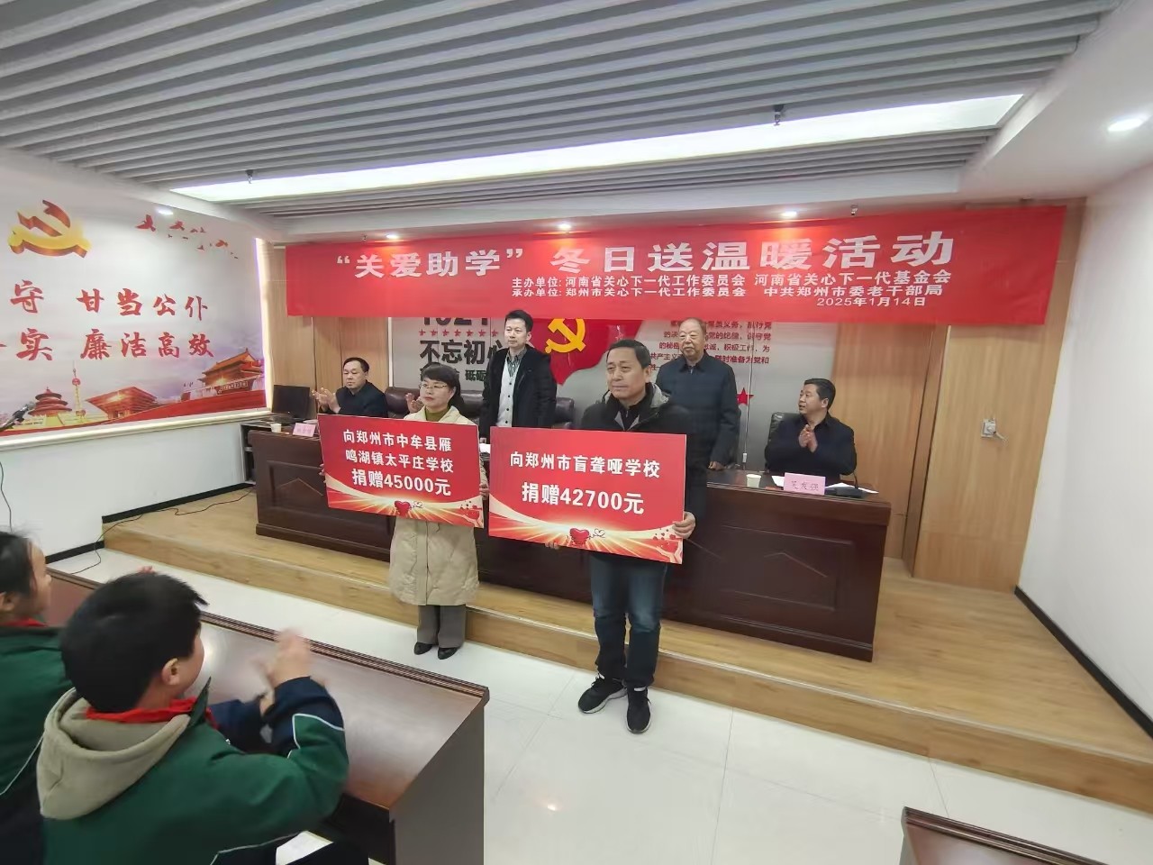 1月14日上午,河南省关心下一代工作委员会、河南省关心下一代基金会联合郑州市关心下一代工作委员会、中共郑州市委老干部局来到中牟县雁鸣湖镇太平庄学校开展“关爱助学”冬日送温暖捐赠活动,向太平庄学校和郑州市盲聋哑学校捐赠资金8.77万元,用于为困难学生购买学习和保暖物品。