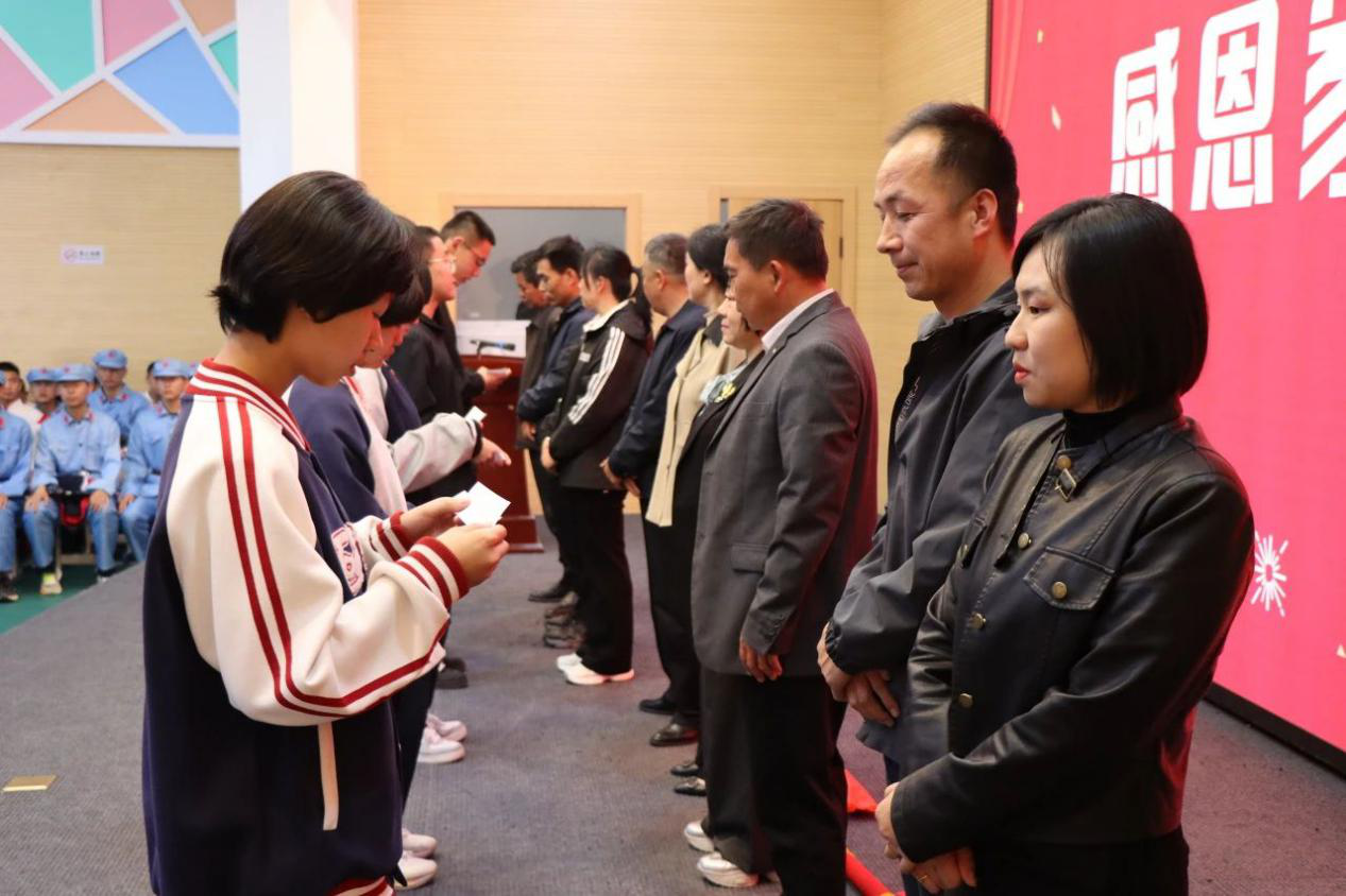 讲座后,学生们分享了从懵懂到成熟的蜕变历程,感谢老师和教官的悉心指导;家长代表哽咽发言,称赞学校将孩子培养为“懂得担当的人”;教师代表则寄语学生坚守信念,未来勇攀高峰。温馨煽情的背景音乐,深深打动了在场的每一个人,学生与家长互诉衷肠、紧紧拥抱,台下的师生、家长感动得热泪盈眶。不少家长和孩子潸然泪下,孩子懂得了家长的不易,家长看到了孩子的成长。许多师生为之动容,这一环节不仅强化了亲子纽带,更展现了感恩教育在成长过程中的深远意义。