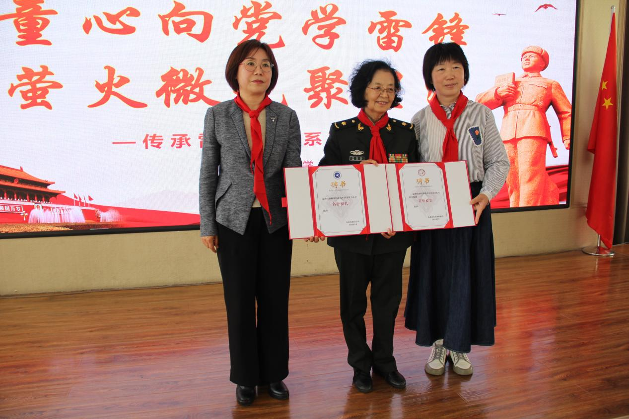 随后,群力小学、东风小学校领导为孙桂琴颁发名誉校长聘书,表达对她一生传承雷锋精神的诚挚敬意。“雷锋朗诵团”卫丹团长、石海滨政委授予两所小学“雷锋朗诵团”称号牌匾及团旗,两所学校庄重地接过牌匾和团旗,意味着雷锋精神将进一步在校园中发扬与传承。于洋老师在致词中,向广大师生们发出“携手共进,以雷锋为榜样,让雷锋精神在新时代焕发出更加耀眼的光芒”的号召。学生代表向特邀嘉宾赠送了精心制作的雷锋形象非遗竹编画,竹编画工艺精美,饱含着学生们对嘉宾的尊敬和对雷锋精神的热爱。