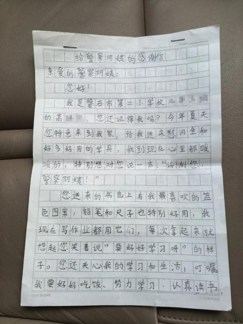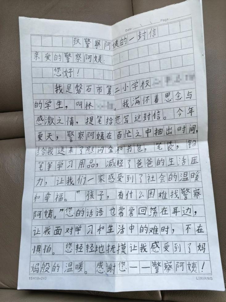 近日,磐石市公安局关工委在开展“警察护苗”行动中,河南街道派出所“警花护苗”工作队,通过在中小学校设立的“警察妈妈信箱”,收到了两封曾经受到“警花”们帮扶的两名小学生的特殊来信。