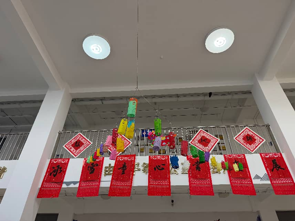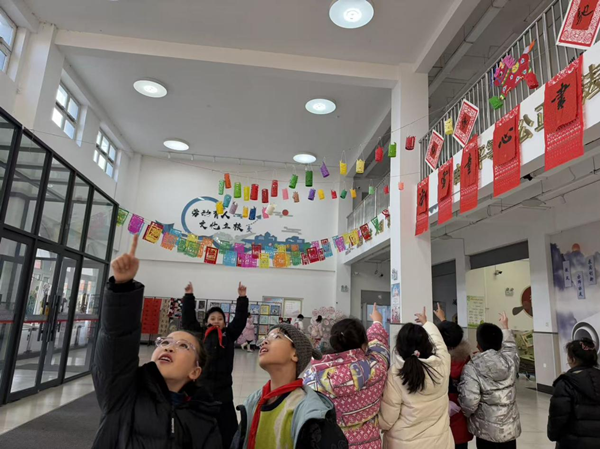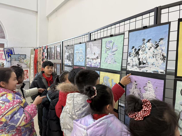 主题展板搭配雪花、灯笼、冰凌等装饰元素,营造出浓厚的冬日节庆氛围。绘画与书法作品错落悬挂,剪纸、纸雕等手工作品悬挂空中,全方位展现师生的艺术素养。