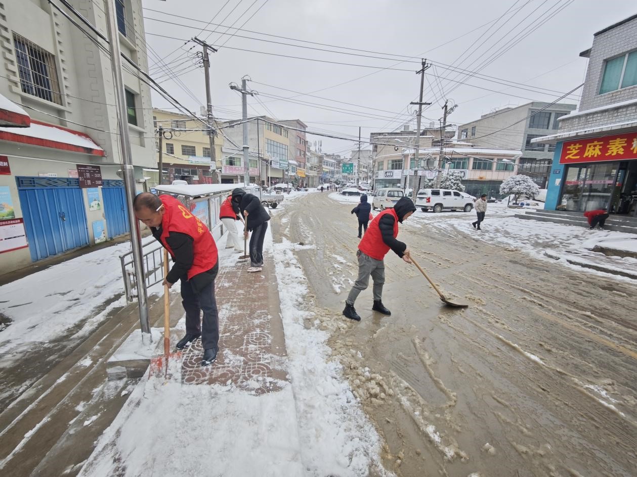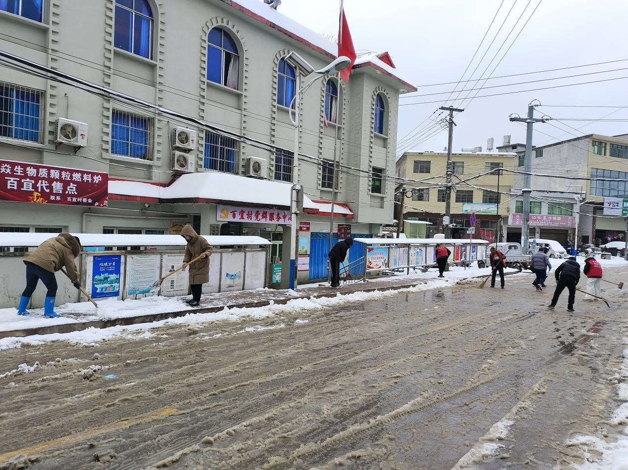 受强冷空气影响,百宜镇内多地路面出现不同程度积雪和凝冻现象,为保道路畅通,1月22日,由百宜镇党委书记、关工委主任罗勇同志带领,组织镇关工委工作人员、综合行政执法大队工作人员、志愿者以及村干部开展扫雪除冰工作,保障群众安全通行,为群众办实事。