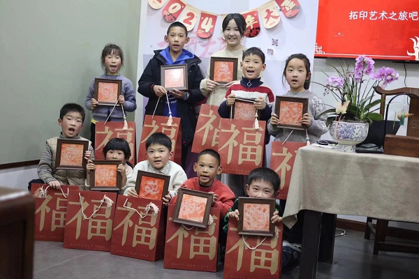 拓印是一种古老的印刷术,发明于东汉汉灵帝时期,因熹平石经的刊刻而发明,是后世雕版印刷的雏形。在简单的介绍了拓印的由来和历史定位后,志愿者老师和孩子们一起选择拓印图案,将白芨水涂在凹凸不平的图案上,随后将宣纸铺平其上,接着用细毛刷轻抚并用鬃刷敲打。随后一幅幅金龙跃然纸上,大家在实践中感受到非遗文化的无穷乐趣。