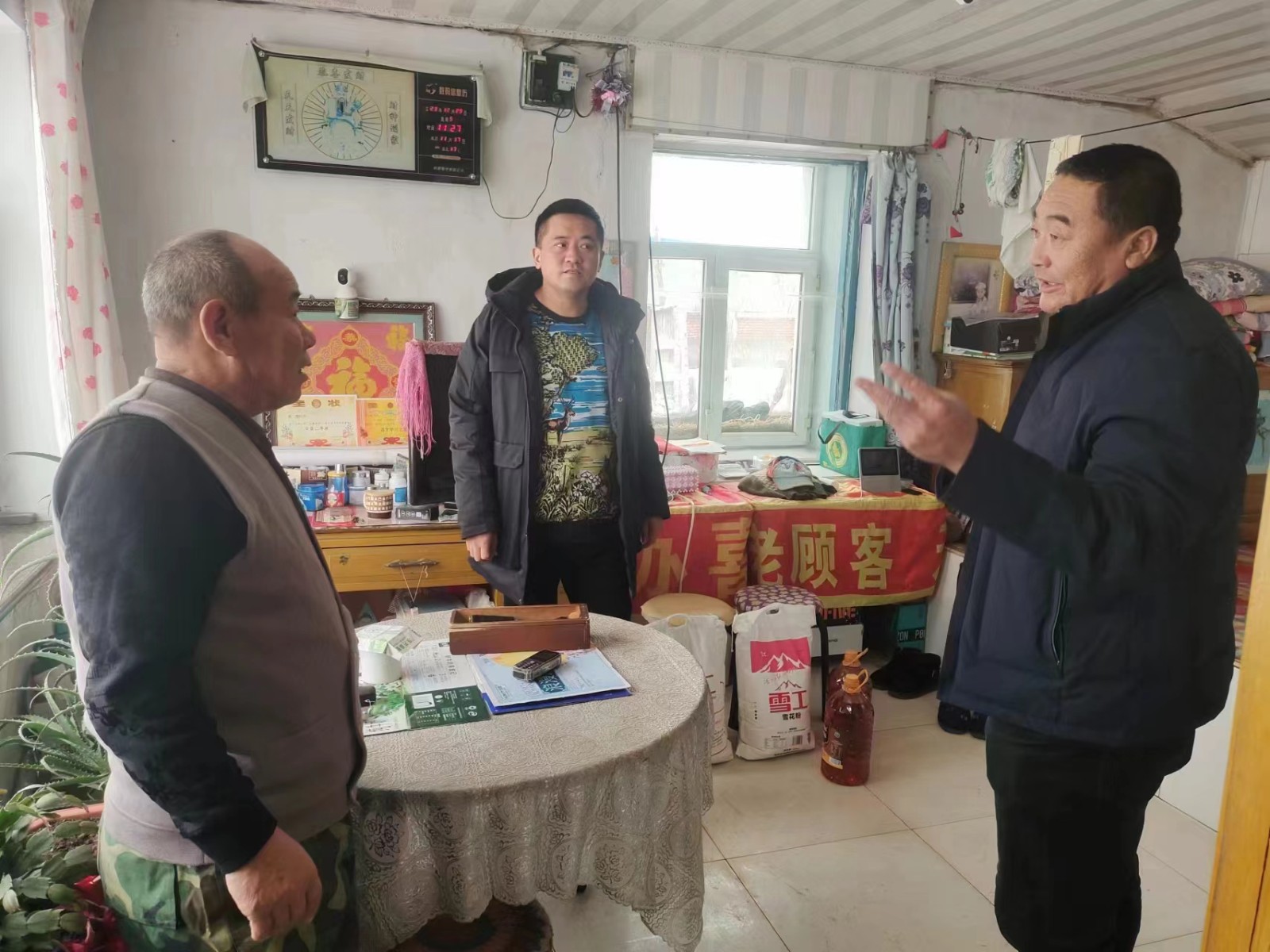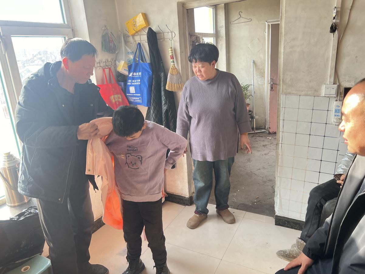 塔子城镇两井子村关工小组常务副组长田景龙(左一)给困境儿童小鹤穿上春节的新衣服