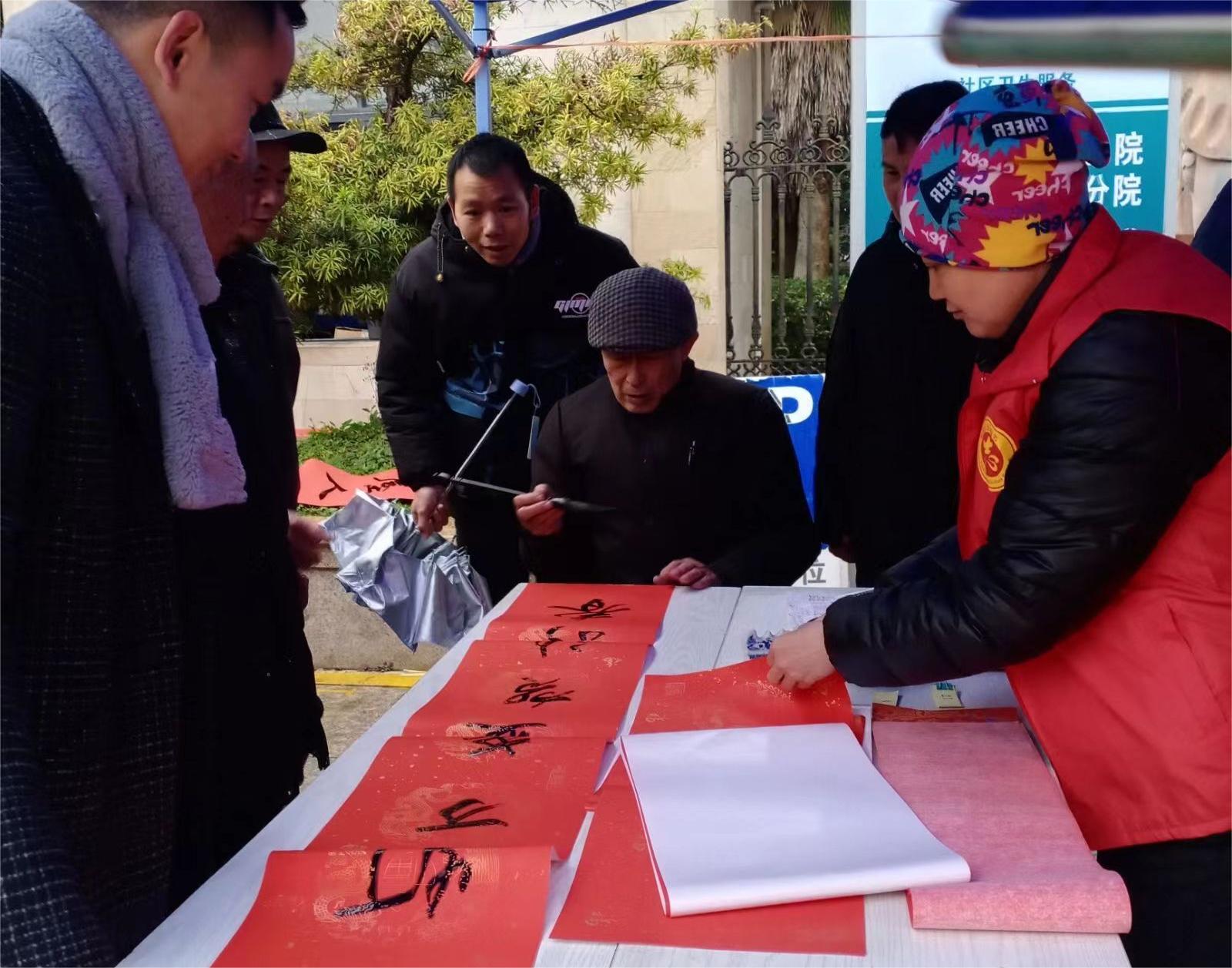 一是社区邀请辖区“五老”书法书法爱好者开展“情满福柳 翰墨飘香”送春联活动。活动现场居民们满怀欣喜地挑选心仪的春联。书法志愿者们铺好红色宣纸,蘸饱墨汁,挥毫泼墨,一幅幅寓意祥和充满年味儿的春联和形态各异的“福”、“招财进宝”跃然纸上。在场的居民对写好的一排排墨香浓郁、祝福满满的春联和“福”字赞不绝口。
