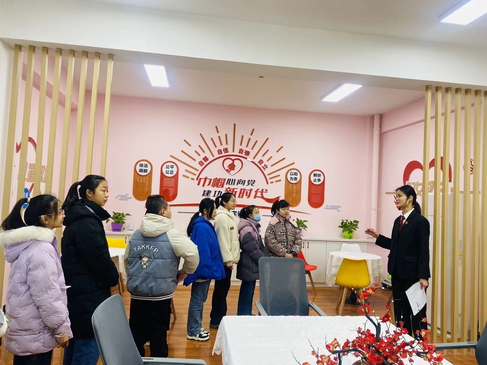 在法院大厅,头屯河区人民法院立案庭庭长张丽华为大家做了简短的介绍,随后由工作人员带领孩子们参观法院内的各个功能室,参观了法院大厅、“红梅调解室”、审判庭等。