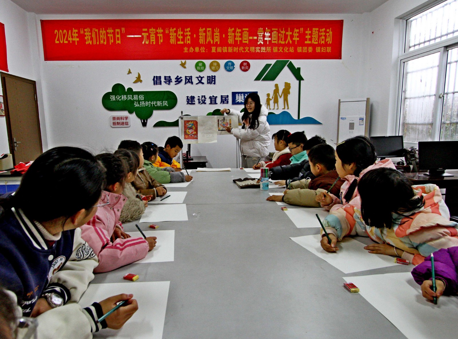 为迎接即将到来的元宵节,丰富孩子们寒假文化生活,2月20日,巢湖市夏阁镇关工委、镇新时代文明实践所、镇综合文化站联合开展2024年“我们的节日”元宵节“新生活 新风尚 新年画——赏年画过大年”主题活动,组织少年儿童赏年画、画年画,传承优秀文化。