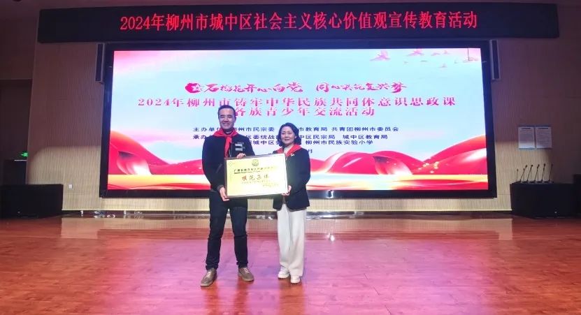 活动现场市民宗委领导为柳州市民族实验小学授“自治区民族团结进步模范集体”牌匾。