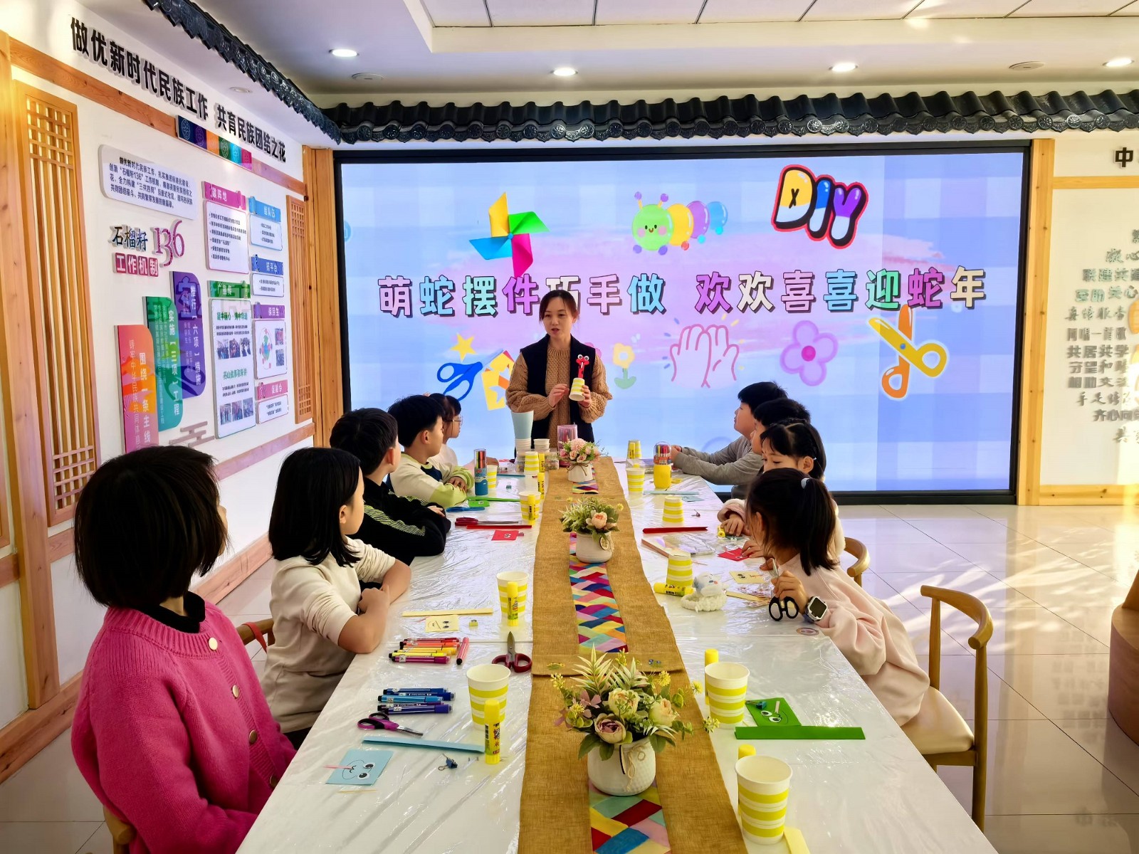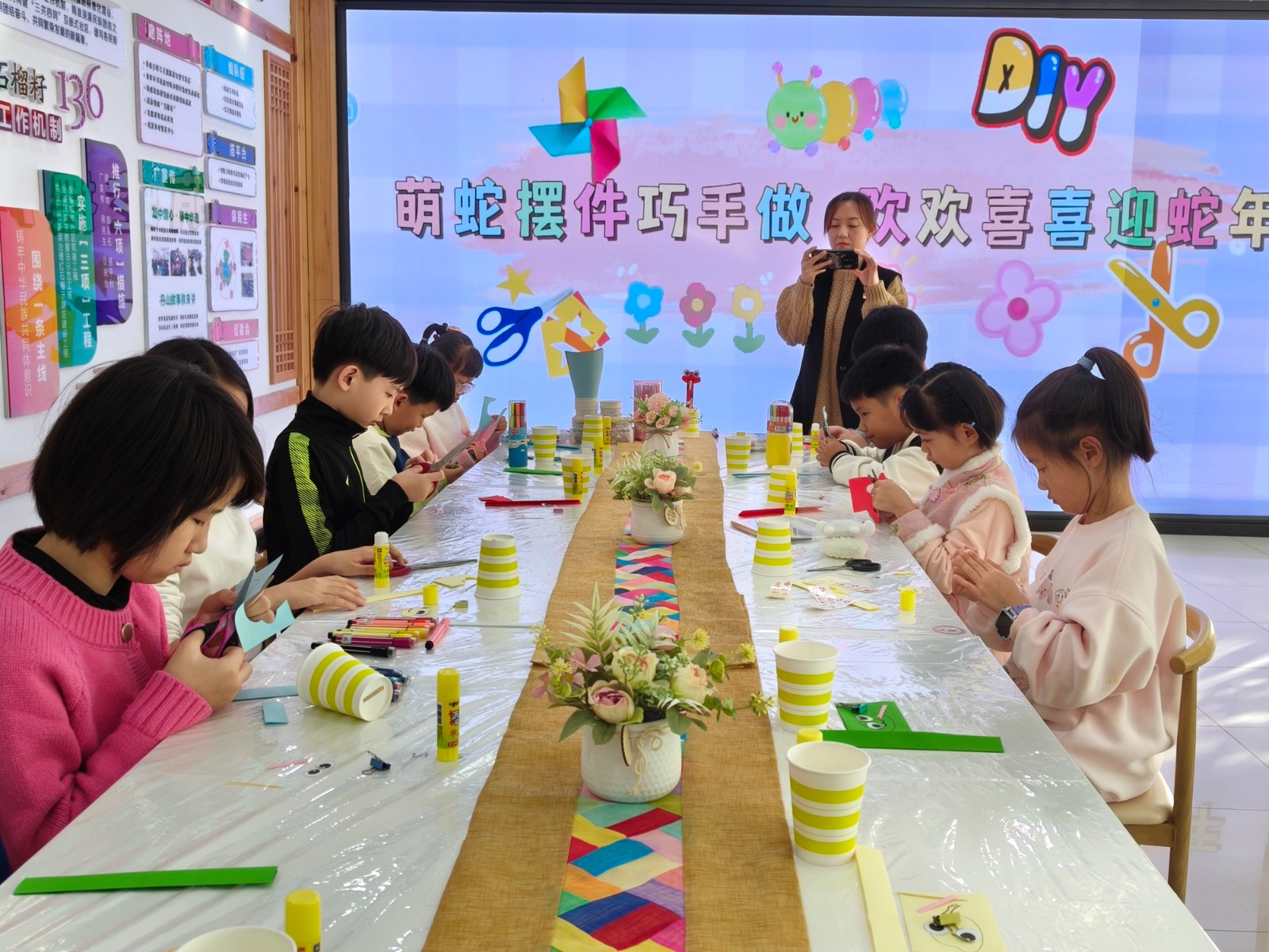 1月3日,又组织孩子们开展了“萌蛇摆件巧手做 欢欢喜喜迎蛇年”手工制作活动,详细介绍了新年的来历和习俗,并向大家讲解如何通过手工剪纸制作萌蛇摆件,让孩子们亲身感受文化传承、了解传统习俗。随后孩子们运用手中的剪刀、胶棒和彩笔,将一张张彩纸精心制作成具有中国传统元素的创意作品,在参与创作过程中得到了传统文化的熏陶。