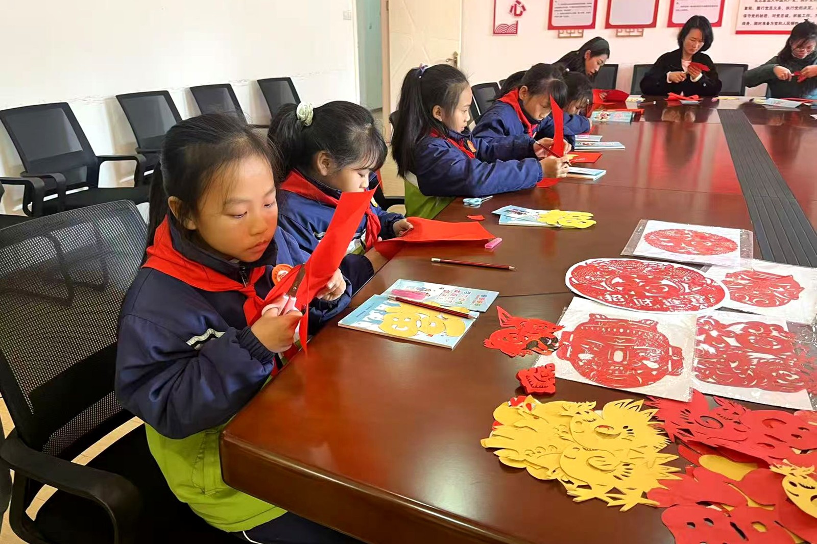 然后,剪纸非遗文化传承人饶爱平老师给孩子们耐心地讲解剪纸的历史渊源、文化内涵以及基本技巧和方法,孩子们聚精会神地聆听,迫不及待地想要动手操作。在饶老师的指点下,学生们随着剪刀的起起落落,一张张红纸变成了灵动的作品,他们剪出了一幅幅精美的“福”字作腊八粥香,氤氲着团圆的味道。