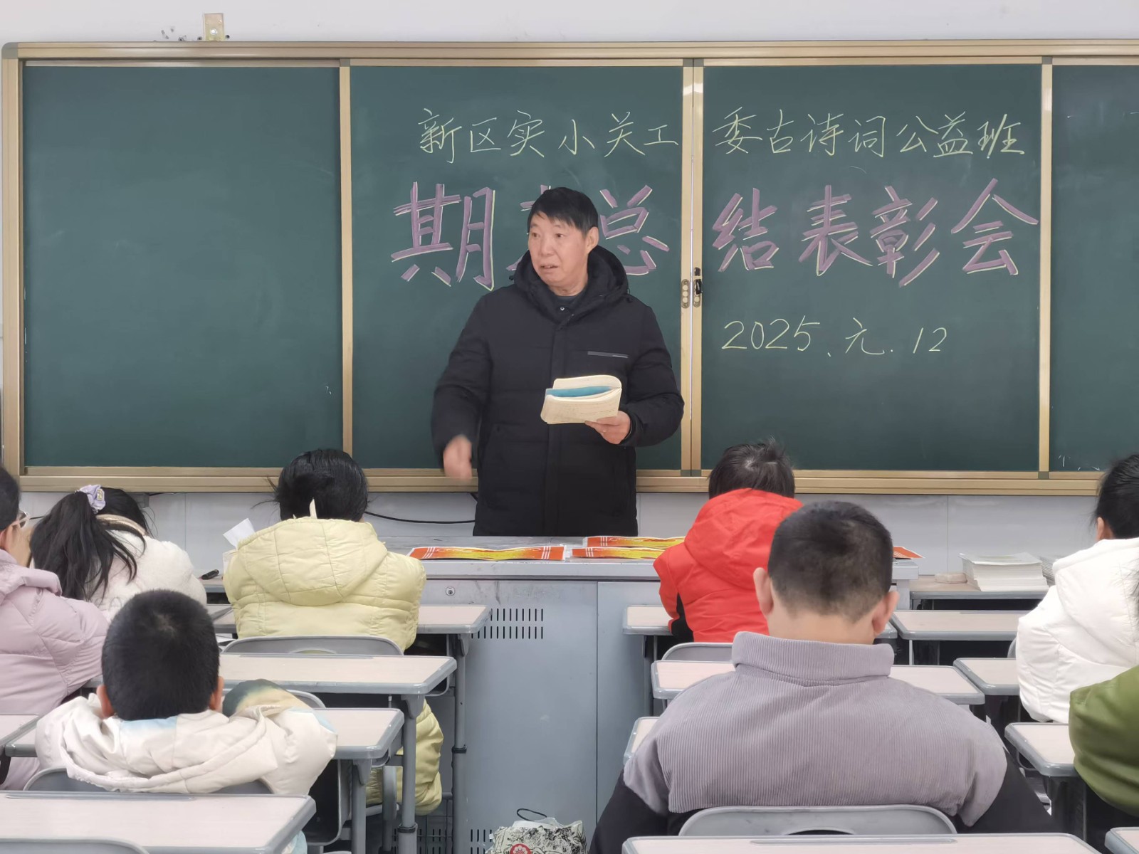 1月12日上午,丹阳市新区实验小学关工委在教学点举行了古诗词公益培训总结表彰活动。学校退教党支部书记、关工委常务副主任步泽舫,关工委骨干成员、古诗词公益培训辅导教师张志良,以及20余名少年儿童学员共同参与了这一活动。