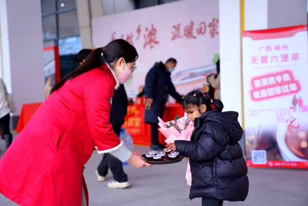 活动中展示了六堡茶技艺,向旅客展现六堡茶的冲泡技艺、品鉴方法及背后的文化故事,让旅客在品味茶香中感受非遗的魅力。“五老”书法家现场挥毫泼墨,为旅客书写春联和福字,传递新春祝福。青年志愿者为旅客提供设备协助、客流引导、重点旅客服务,让旅客出行体验更美好。