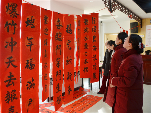 活动现场,红纸铺开,墨香四溢,三位书法老师挽袖执笔挥毫泼墨。大家一边欣赏着书法艺术,一边品读着春联的美好寓意,现场气氛一派祥和。一幅幅吉祥喜庆、墨宝飘香的春联寄托了居民们辞旧迎新、接福纳祥的美好愿望,居民们争先恐后地挑选自己喜欢的“福”字和对联,为即将来临的春节增添了浓浓的喜庆氛围。居民赵丽说:“过年贴春联是传统习俗,手写的春联比买的更有年味,这样的活动非常好。”