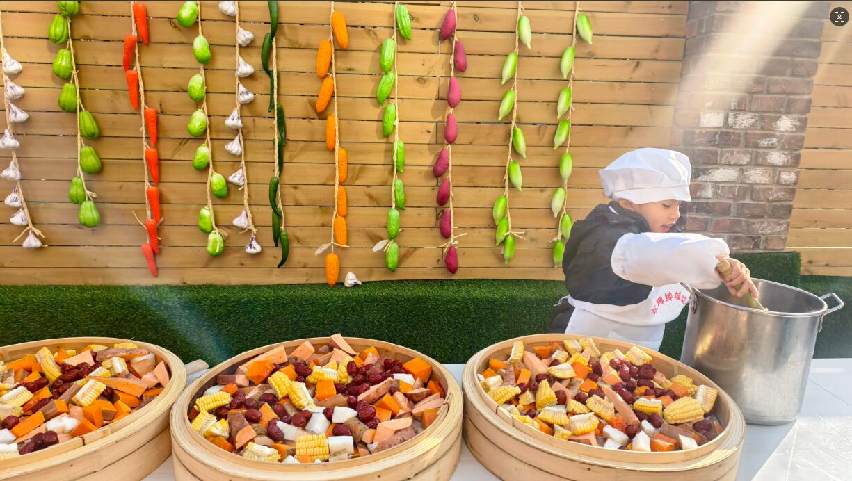 活动现场,孩子们身着可爱的厨师服,头戴洁白的厨师帽,一个个化身小小厨师,脸上洋溢着兴奋与期待的笑容。在老师的引导下,他们亲自动手参与到丰收的喜悦中来。孩子们围在桌子旁,好奇地摆弄着食材。有的孩子小心翼翼地将南瓜放入水盆中清洗,那认真的模样仿佛在对待一件珍贵的宝物;还有的孩子则兴致勃勃地在大盆里清洗红薯,小手在水中欢快地拨动,感受着食材的质感。这些新鲜的食材,都是丰收的象征,让孩子们在实践中体验到了劳动的乐趣和丰收的来之不易。