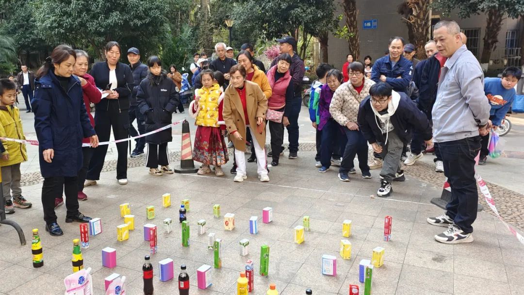 在“迎新春游园”区充满了欢声笑语,本次游园有幸运套圈、盲人敲锣、青蛙跳水等游戏项目,每项游戏都吸引了不少青少年和居民排队参与。其中简单又奖品丰富多样的幸运套圈最受大家欢迎,居民们纷纷使出浑身解数,有的居民弯腰俯身,全神贯注地瞄准目标;有的则侧身而立,精准地投掷套圈。现场气氛热烈非凡,不时传来“套中了”的欢呼声以及“再来一次”的开怀笑声。
