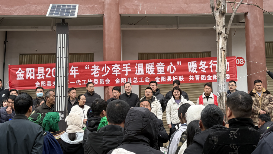 1月21日,四川省凉山州金阳县关工委联合县总工会、县妇联和团县委在天地坝镇东山社区开展“老少牵手·温暖童心”暖冬行动,为该社区203名青少年及家庭送上书包、大米、食用油等物资组成的“暖心礼包”和新春的温暖与关怀。县委常委、组织部长、关工委主任尚侠义出席活动并讲话,