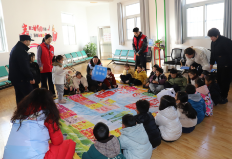 一块巨大的普法飞行棋棋盘格外引人注目,棋盘上的每一格都巧妙地融入了与日常生活息息相关的法律小知识。孩子们兴奋地围坐一圈,逐一掷骰子,根据骰子的点数在棋盘上前进。每当棋子停在一格,社区民警就会耐心地读出相应的法律问题,并举例帮助孩子们理解“小朋友在马路上捡到钱应该怎么办呀”“能不能自己一个人去河边玩耍呢” “过年能不能放鞭炮呀”等,孩子们积极地思考的同时,还收获社区准备的“消防安全钥匙扣”。通过角逐,让孩子们在轻松愉快的氛围中,逐渐了解生活中的哪些行为是合法的,哪些是不应该做的。