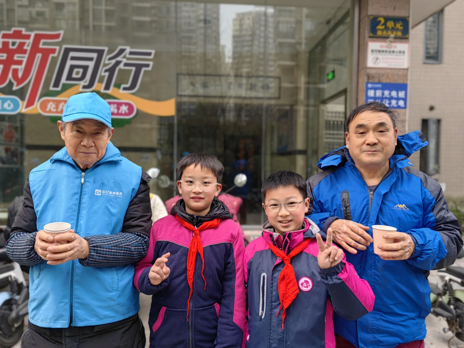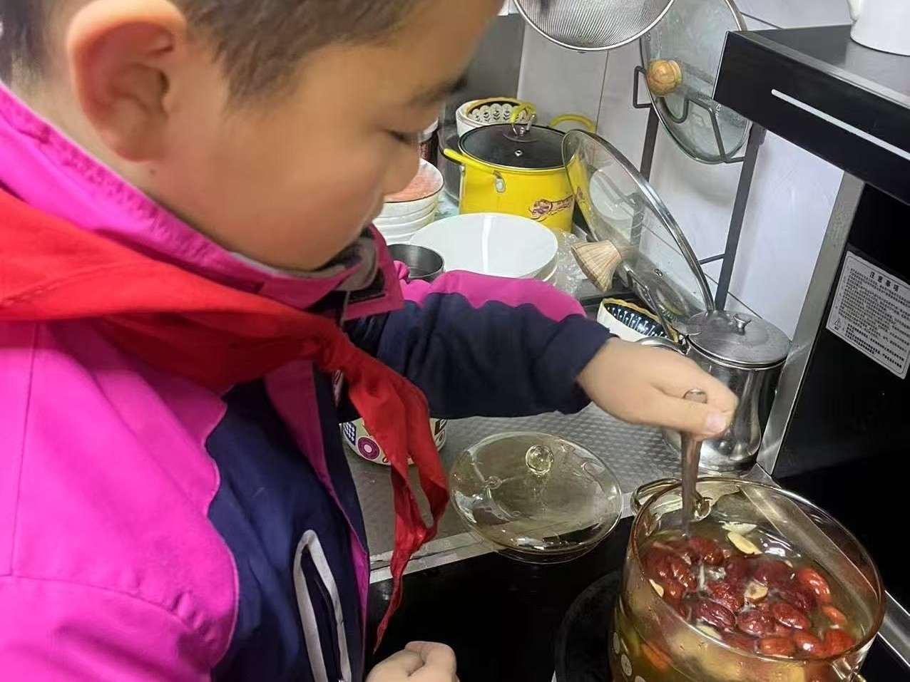 一大早,孩子们就忙活起来了,在家长的指导下把生姜切片,再搭配红枣、枸杞、红糖,一起放入锅中慢慢熬煮。孩子们站在锅边用心看护,看着锅里的水慢慢变成热气腾腾、香气四溢的姜茶,每个人脸上洋溢着无比开心的笑容。大家把姜茶装入保温壶中,怀揣着满满的热情与爱心,踏上了“姜”爱传递的暖心之旅。“阿姨,谢谢您在清晨为我们带来了整洁的环境,您辛苦了!”“叔叔,请您喝一杯姜茶,暖和一下吧。”……伴随着一句句亲切的问候,孩子们将自己亲手制作的姜茶递到了保洁员、环卫工、外卖员手中。接过姜茶的那一刻,户外劳动者的脸上露出了幸福的笑容,热乎乎的姜茶不仅温暖了他们的掌心,更加温暖了他们的心窝。