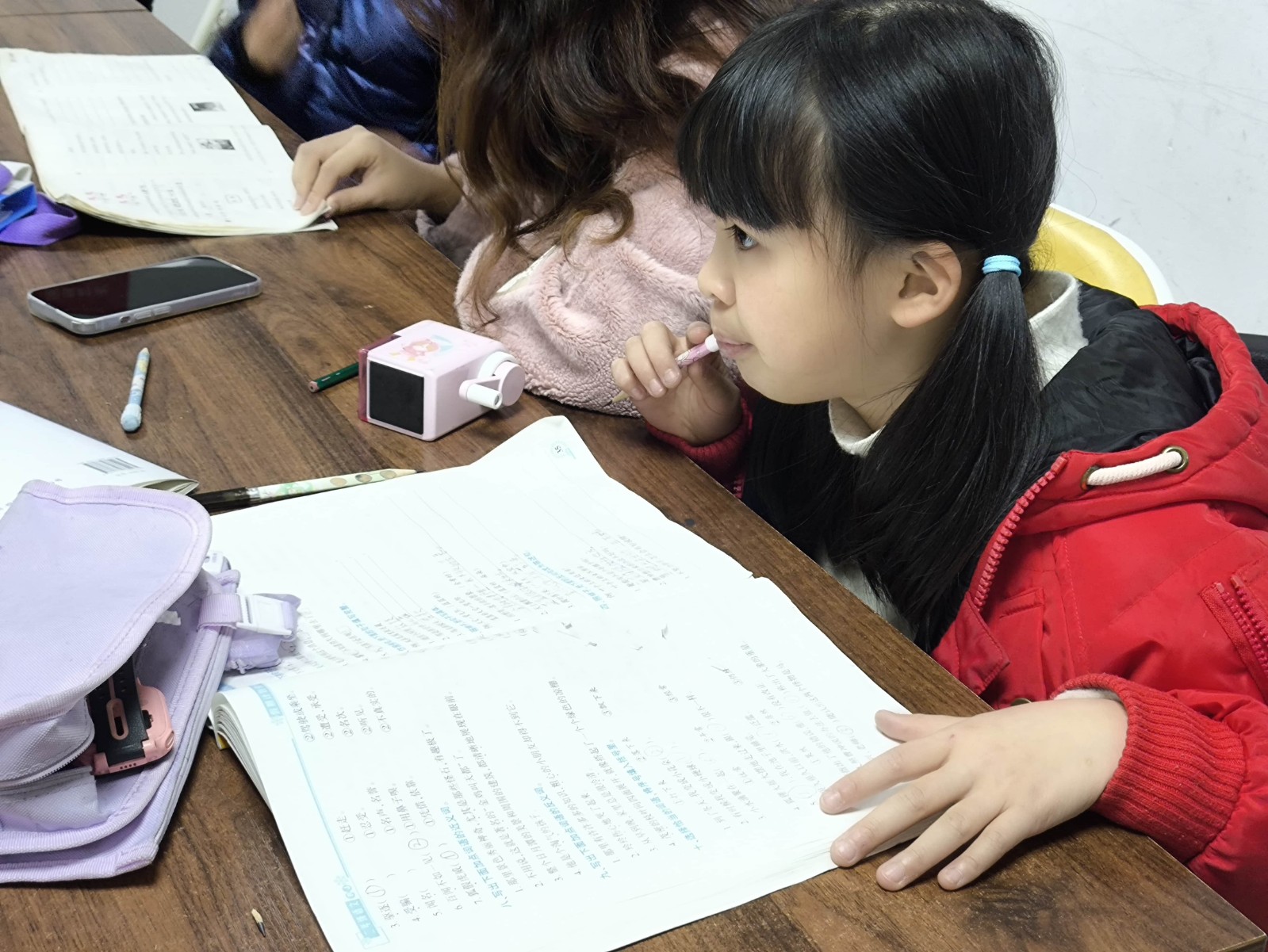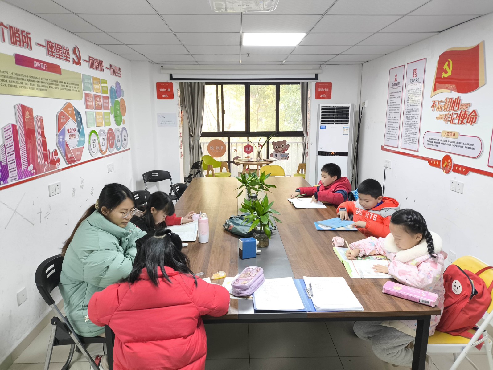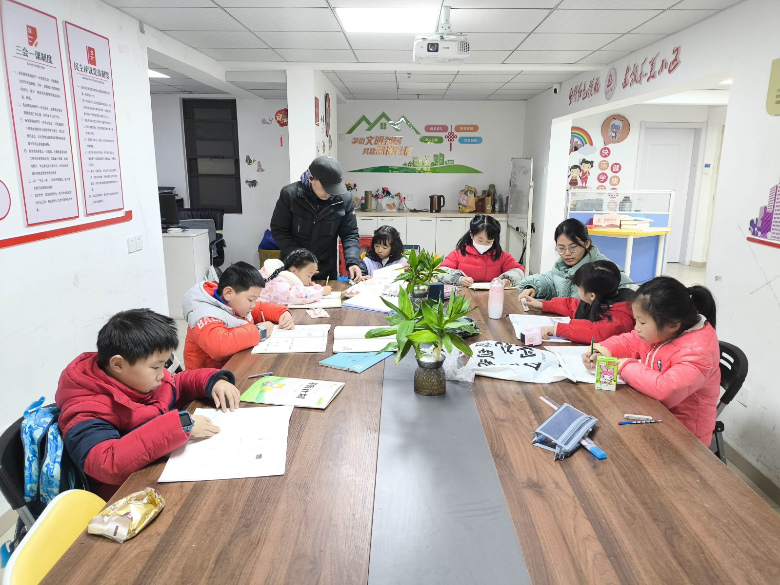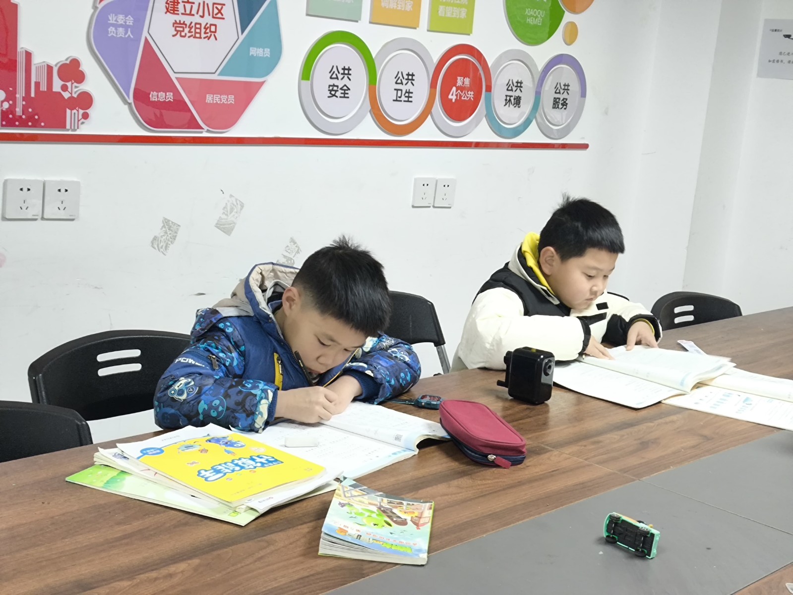 活动开展地点位于杭川社区旭辉御府红领哨所,宽敞明亮的空间为学生们提供了良好的学习环境。社区邀请了大学生志愿者老师参与此次托管服务。每天上午 9 点至11 点,学生们在老师的指导下,有序地完成寒假作业。志愿者老师不仅耐心解答学生在作业中遇到的各种问题,还根据学生的学习进度和知识掌握情况,进行有针对性的辅导,帮助学生查缺补漏,巩固知识。