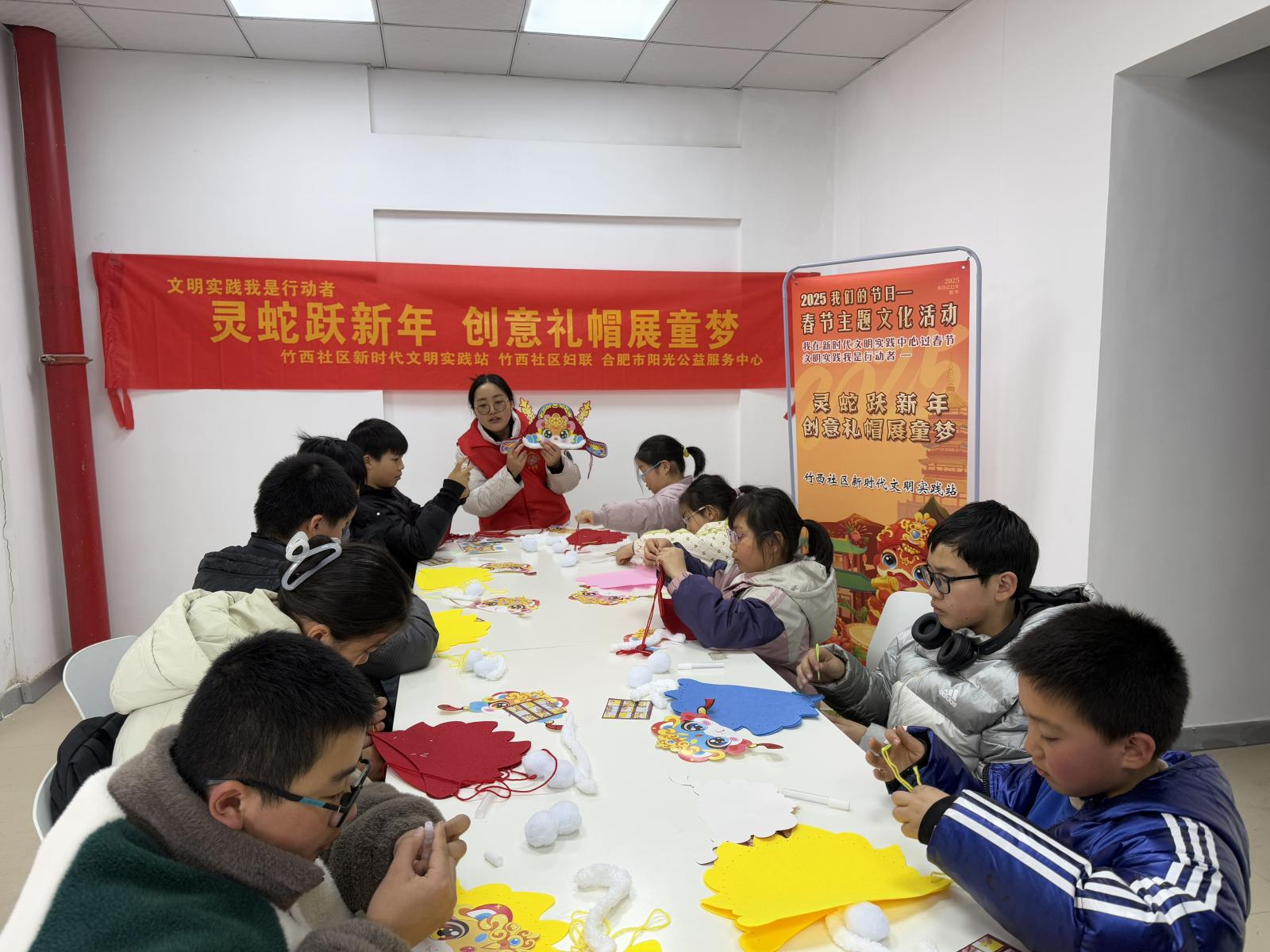志愿者老师通过生动有趣的讲解和形象的示范,向孩子们详细介绍了蛇年的文化内涵以及礼帽的制作方法和技巧。孩子们围坐在一起,精心制作属于自己的蛇年礼帽,他们的创作热情和动手能力让整个活动室充满了浓浓的节日氛围。