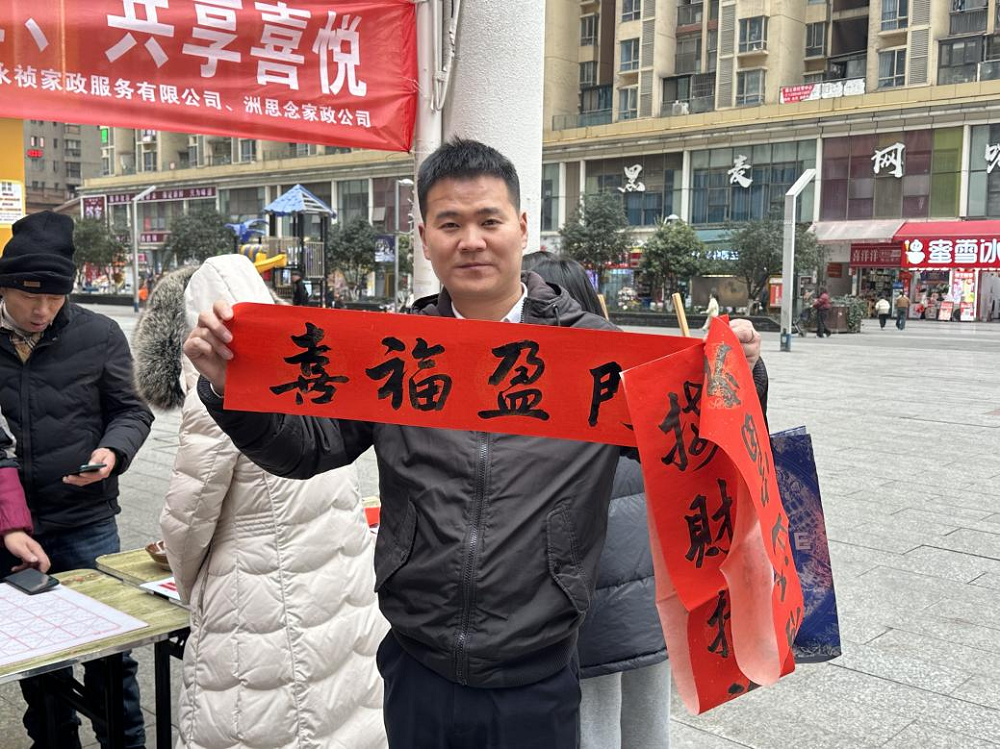 活动现场,红纸铺展、翰墨飘香。书法家们笔力遒劲,墨舞飞扬,大家齐聚一堂,挥毫泼墨,手中的毛笔龙腾蛇舞,笔锋婉转间,一个个苍劲有力、潇洒飘逸的书法字体跃然纸上。“天增岁月人增寿,春满乾坤福满门”“一帆风顺年年好,万事如意步步高”,一句句美好的祝福化作春联上的文字,寄托着人们对新年的憧憬和祈愿 。前来参与活动的居民们,一边欣赏书法创作,一边挑选自己心仪的春联内容。不少小朋友也在家长的带领下积极参与其中,他们好奇地看着书法老师们书写,眼中满是对传统文化的新奇与热爱。一位居民感慨道:“现在过年很多都是买现成的春联,今天能拿到书法家现场写的春联,感觉特别有意义,让春节更有传统的氛围了。”本次活动,共免费送出30余副春联。