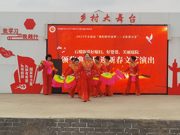 1月24日,江苏省连云港市东海县石榴街道新时代文明实践所在讲习村乡村大舞台举办“我们的中国梦——文化进万家:好媳妇 好婆婆 美丽庭院颁奖典礼暨迎新春文艺演出”。关工委“五老”红歌演唱队12位老同志冒着寒冷来到江苏省和美乡村——石榴街道讲习村老百姓演出,受到观众热烈欢迎。