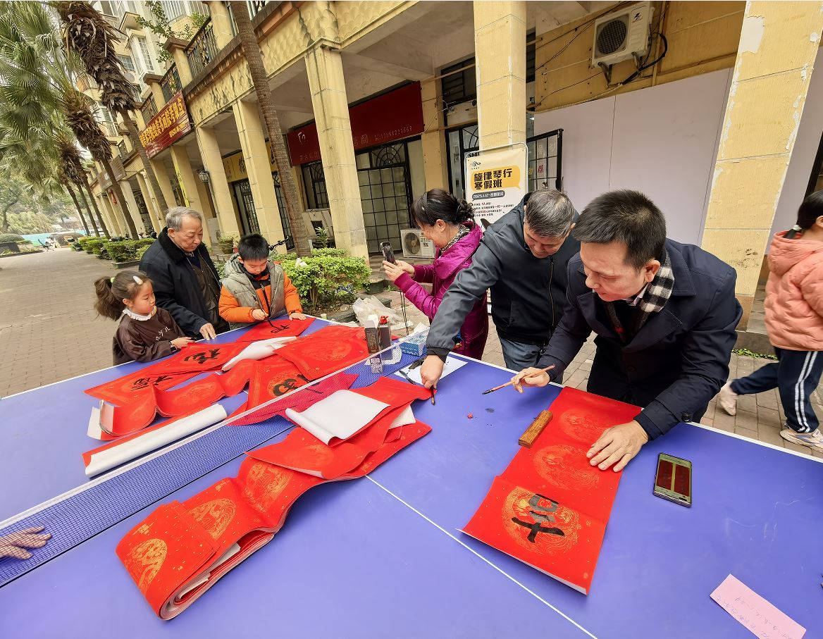 游园活动设置了“趣味套圈”“步步为营”“欢乐投壶”等多个项目,大家热情高涨,积极参与,收获满满的欢乐与喜悦。辖区退休老党员、书法爱好者们也齐聚活动现场给大家写对联,他们各显身手,倾情挥墨,用笔书春,用字迎春,居民们开心地将一副副对联摆在一起晾干,脸上洋溢着幸福的笑容。同时,社区志愿者还向大家发放垃圾分类、禁毒、反邪教等宣传单,向大家宣传垃圾分类、禁毒、反邪教知识;派出所同志用通俗易懂的语言,为居民详细讲解电信诈骗的常见类型,提醒居民时刻保持高度警惕,提升反诈意识。