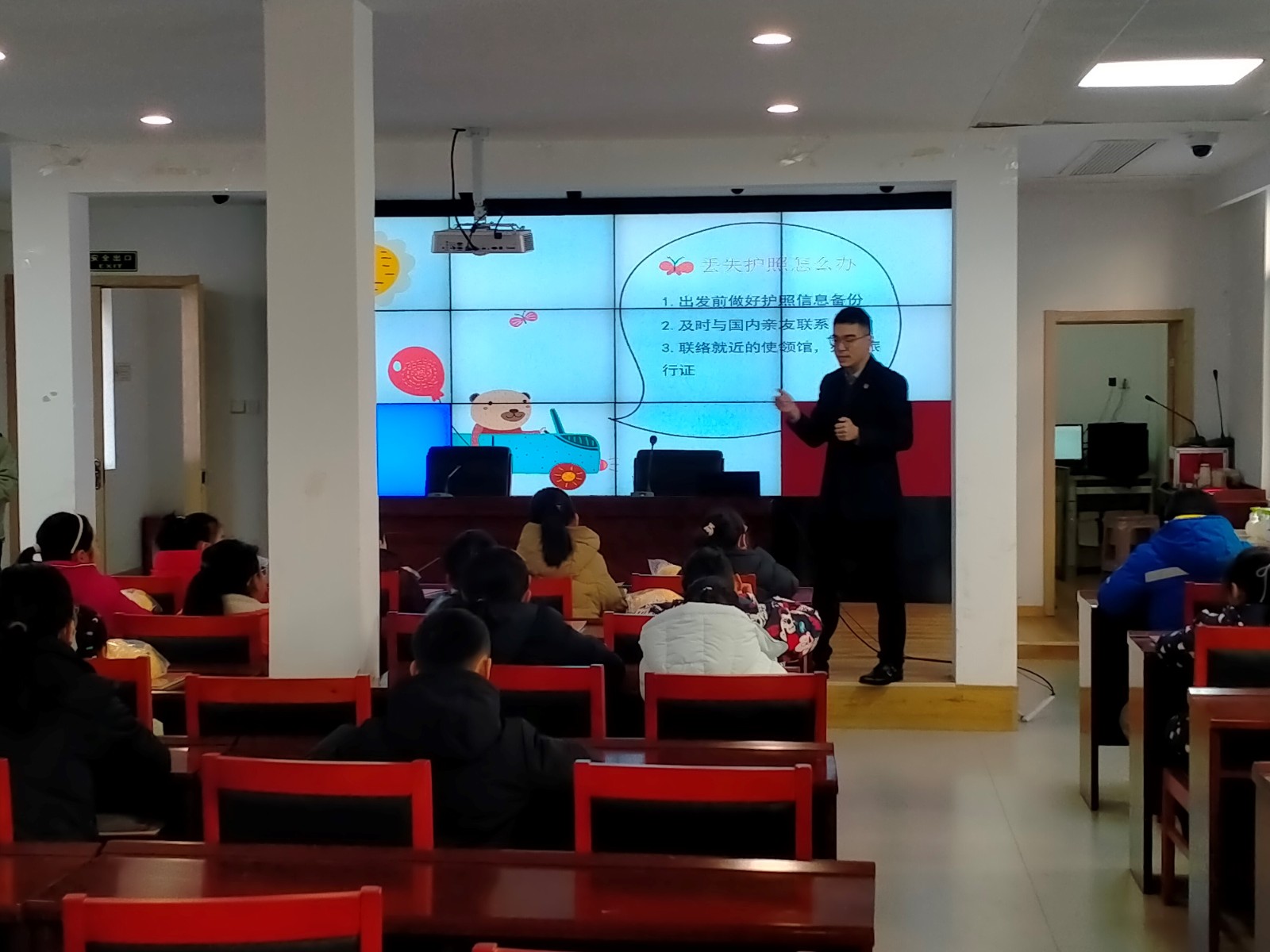 1月17日,南京市建邺区莫愁湖街道建邺区莫愁湖街道艺苑社区特邀南京市人民政府外事办公室工作人员到社区校外教育辅导站开展“海外领事保护进社区”科普讲座活动。