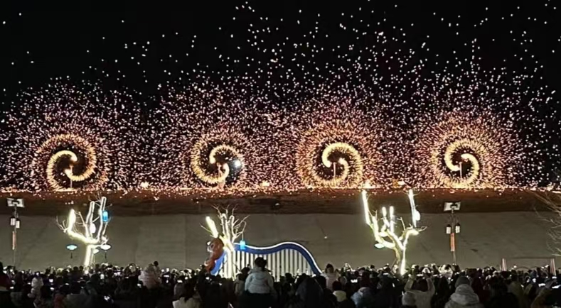 甜糯的糖画,以其细腻如丝的线条,勾勒出一幅幅如梦似幻的图案,仿佛童年的甜蜜记忆在舌尖上缓缓绽放;而那软糯香甜的元宵,宛如一颗颗圆满的明珠,象征着团圆与美满。 劲道十足的烙馍卷馓子,每一口都是对味觉的极致挑逗,让人在回味中久久沉醉。这些非遗小吃,不仅是一场味蕾的盛宴,更是文化与情感的深情交融,让每一位学生都能在这片美食的天地里,尽情领略蛇年春节的独特魅力,感受那份源自心底的温暖与喜悦。市集上,玩偶装饰如繁星,纯真梦幻。气球小丑创梦表演,高跷小丑踏乐欢笑。大唐不倒翁舞韵雅致,穿越历史沉淀,共织欢乐氛围。打铁花是最精彩的表演,只见匠人们手持铁锤,于炽热的铁砧上奋力击打,每一次锤击都伴随着火星四溅,犹如漫天繁星骤然点亮夜空。火花在空中飞舞、盘旋,最终化作一朵朵绚烂夺目的火树银花,每一朵都闪烁着璀璨夺目的光芒,将整片夜空装点得如梦如幻,美得令人窒息。