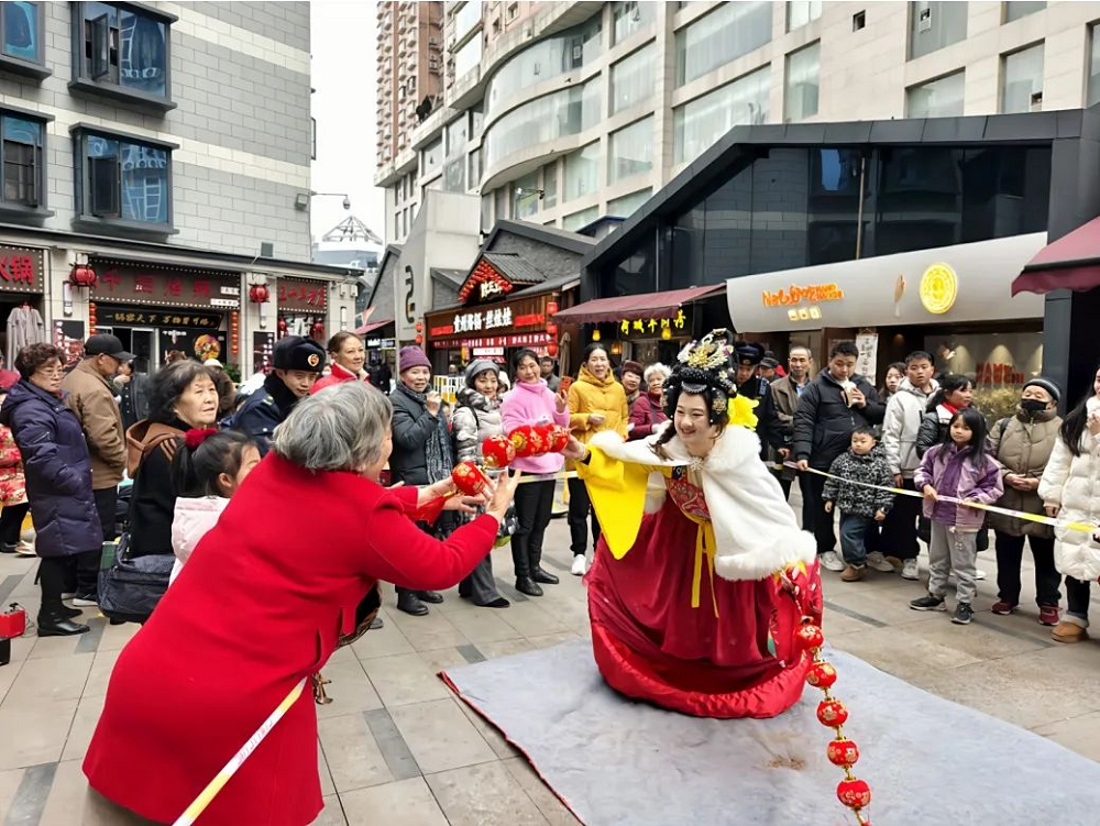 紧接着的川剧变脸表演将活动推向首个高潮。演员身着锦绣戏袍,伴随激昂锣鼓声,脸谱瞬息万变,从红脸关公到蓝脸窦尔墩,十余次变换行云流水,最后以一张笑脸面具向观众拱手贺春引阵阵喝彩。期间,还有身着古风襦裙的大唐不倒翁演员手持团扇与观众互动,大家争相上前轻触其指尖。