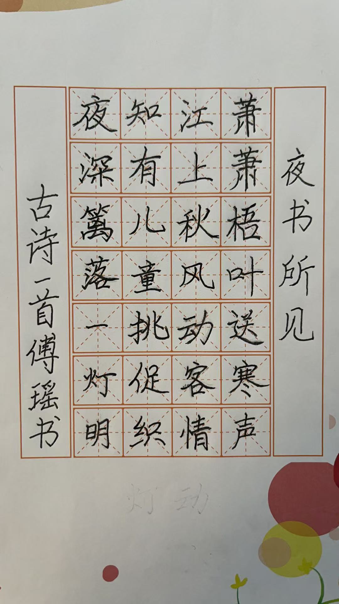 第三个环节是书法作品展示。陶老师发作品纸人手一张,软笔、硬笔不限,利用30分钟完成一幅作品。通过三位评委老师的点评,评出一等奖1人;二等奖2人;三等奖3人。获奖的同学均有小礼品一份,活动在热烈的掌声中结束。