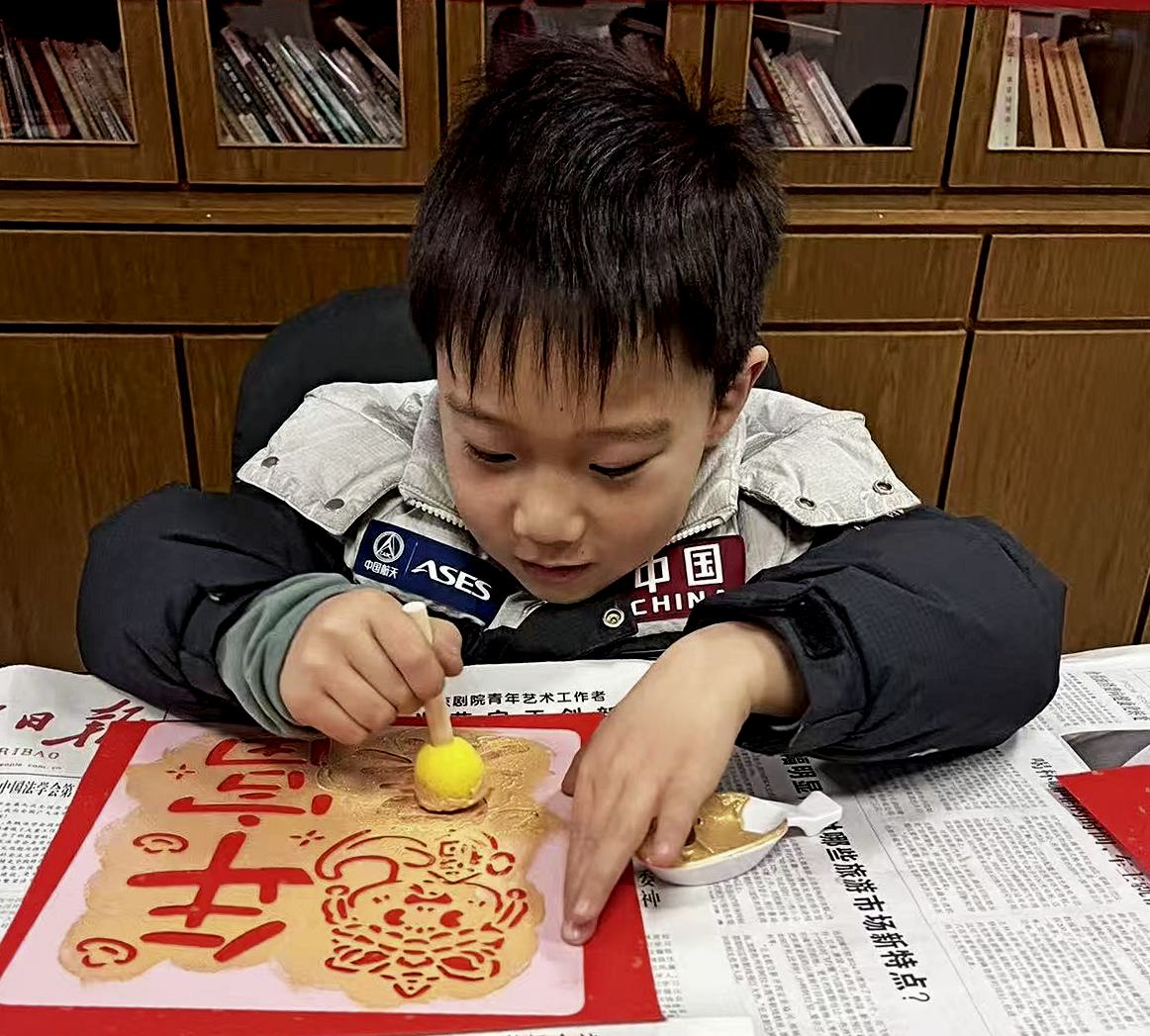 活动现场,孩子们围坐在长桌两边,眼神中充满了好奇与期待。志愿者老师耐心地为孩子们讲解拓印福字的技巧和步骤。红色的纸张、小巧的拓印工具、金黄和墨黑色的两种颜料整齐地摆放在桌上。随着活动的开始,孩子们纷纷拿起工具,小心翼翼地在纸上操作起来。有的孩子专注地涂抹颜料,有的则轻轻按压,力求将福字完美地拓印出来。不一会儿,一幅幅充满童趣的吉祥词语作品便跃然纸上,孩子们脸上洋溢着自豪的笑容,现场充满了欢声笑语。