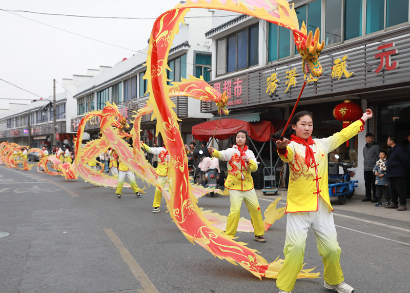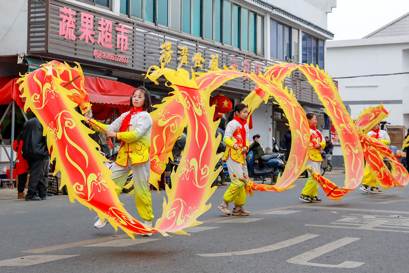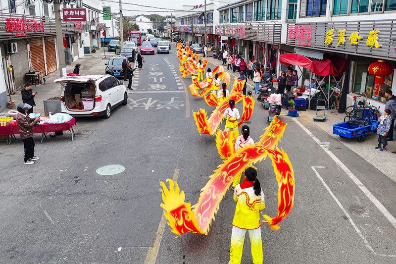 上午 9 点,在志愿者何飞林、相洵瑜老师的带领下,身穿武术服装的17 位学生在赤岸大街一字排开,表演队伍绵延60多米。随着激昂的《中国龙》音乐响起,一场精彩绝伦的彩带龙表演正式拉开帷幕。一条条的彩龙在学生们手中上下翻飞、旋转舞动,犹如金蛇闹春。鲜艳的彩带龙与孩子们灿烂的笑容相互映衬,构成了一幅喜庆祥和的画面。村民们纷纷拿出手机,记录下这一美好瞬间,现场掌声、欢呼声此起彼伏。