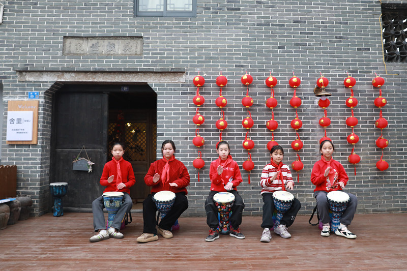 与此同时,在钱氏老宅的灯笼墙前,五名学生奏响了充满异域风情的非洲鼓。激昂的鼓点、明快的节奏,与传统的彩带龙表演相得益彰,让村民们在欢乐中感受到了文化的多元魅力,为古老的村庄注入了新的活力。