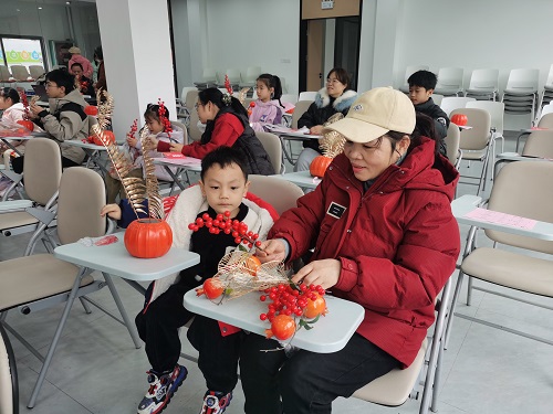 柿子在传统文化中象征着 “事事如意”,是吉祥的象征。活动中,各式各样的精致装饰配件琳琅满目,造型别致的柿子罐、饱满圆润的石榴果、红彤彤的发财果、金灿灿的银杏叶以及寓意吉祥的福字挂件等,承载着人们对新年的美好祈愿。大家迫不及待地动起手来,个个跃跃欲试,细致的装好柿子,绑牢绳子,放进花瓶,遇到难题互相询问,在相互交流协作和其乐融融的氛围中,一个个鲜艳夺目、寓意美好的摆件呈现在大家眼前,大家看着自己精美的作品,互相称赞。活动现场充满了欢声笑语,不论是大朋友,还是小朋友都对此次活动称赞道好。