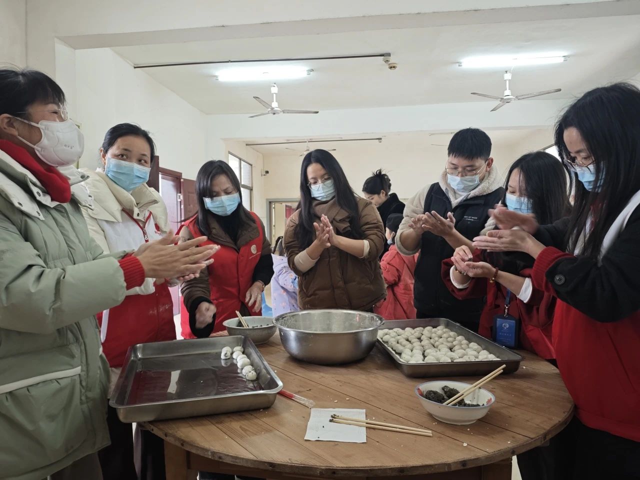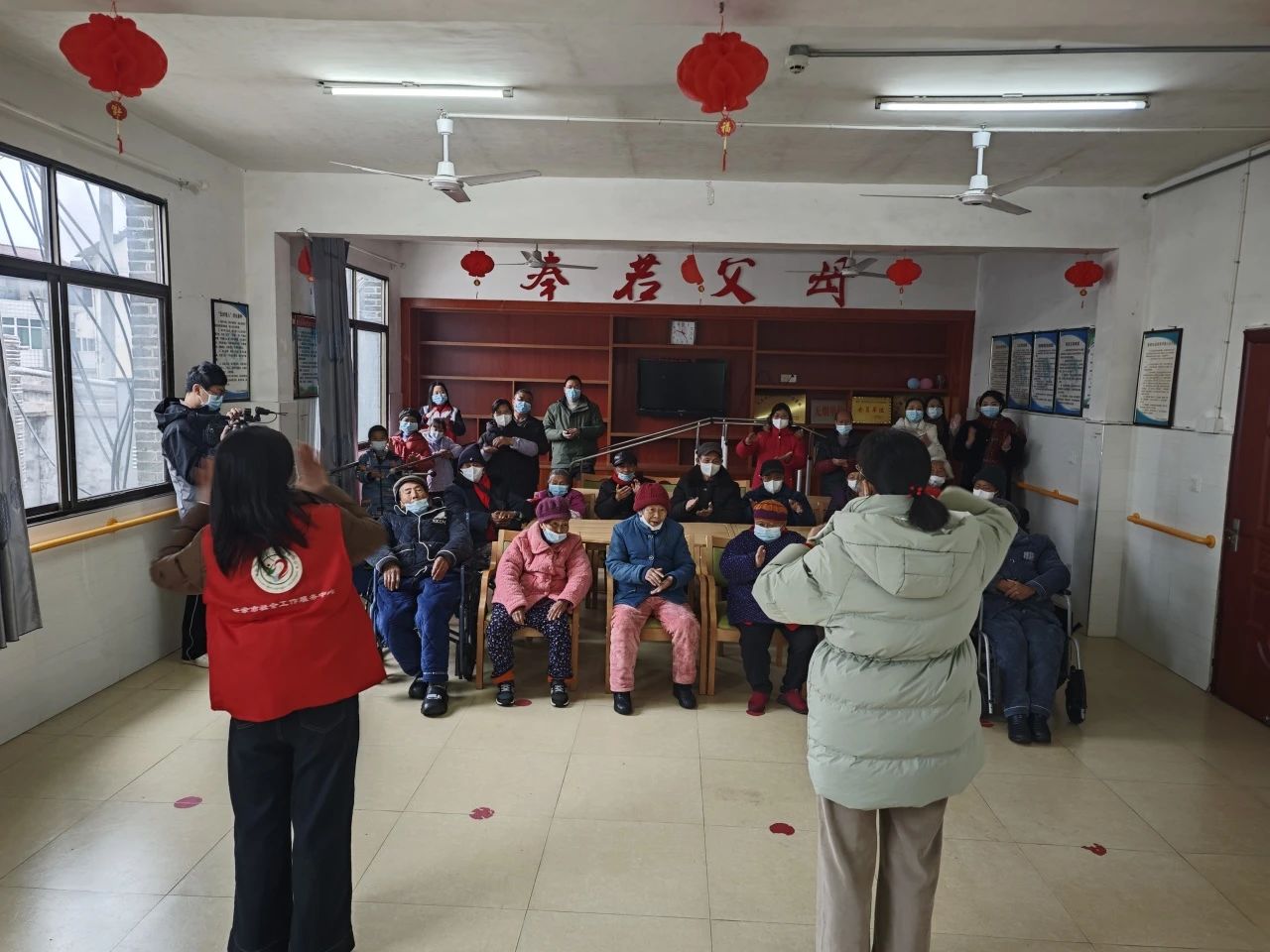 活动当天,敬老院内灯笼高挂,暖意融融。志愿者们以一段轻快的手势舞《卖汤圆》拉开活动序幕,老人们跟着节奏拍手互动,眉眼间满是笑意。