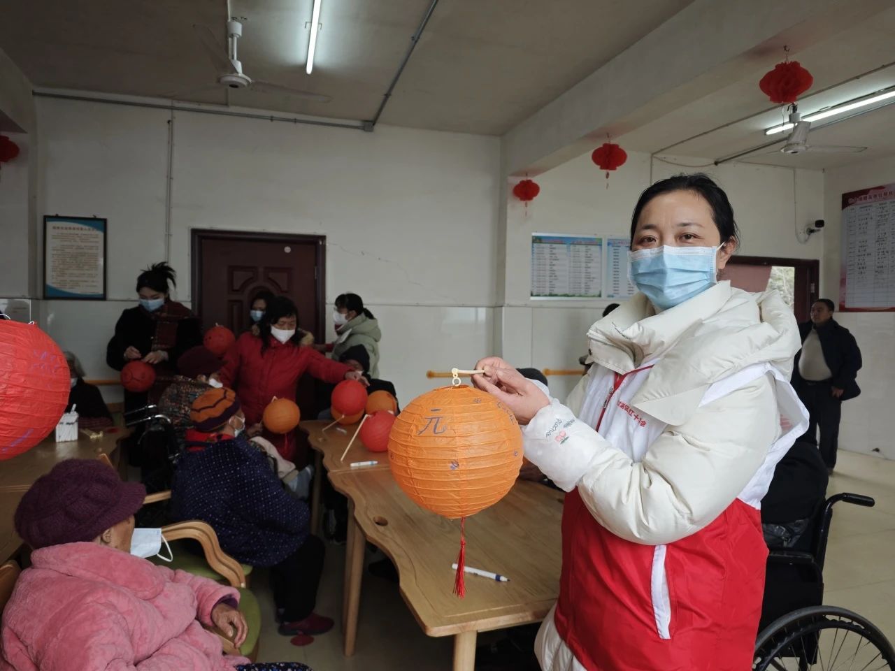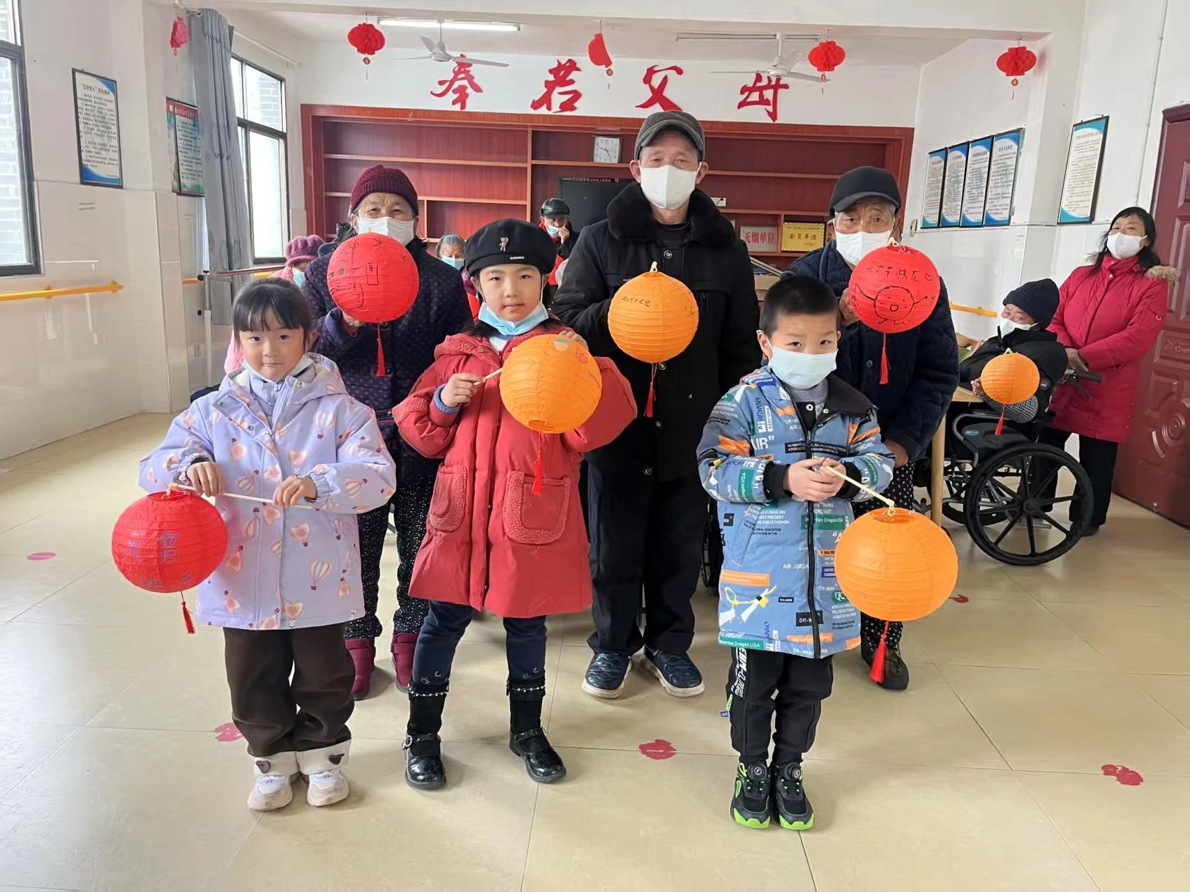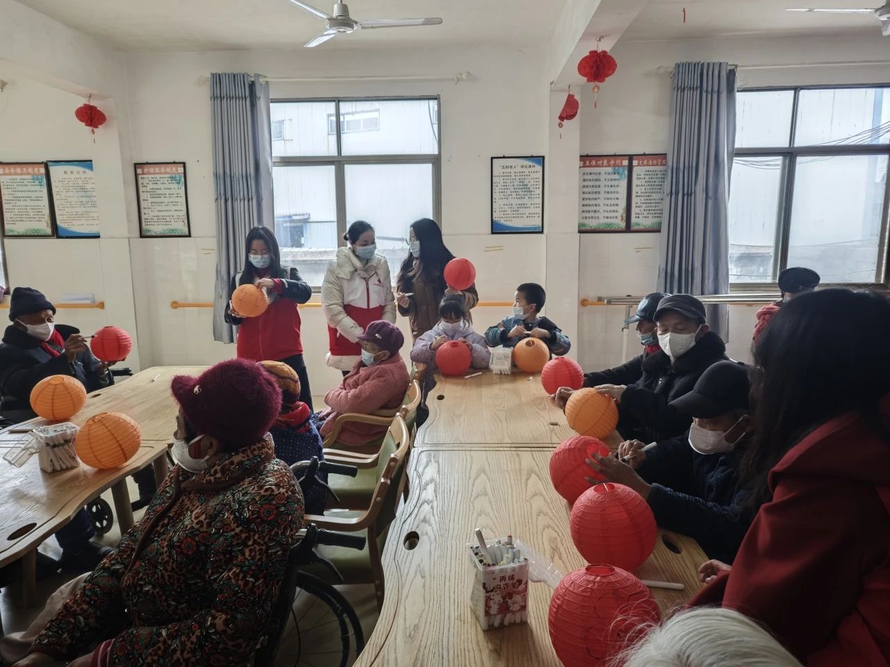 在欢快的暖场节目后,志愿者给每位老人分发空白花灯和彩绘工具,在志愿者协助下,老人们一笔一画勾勒出喜庆的图案,提着自己制作的花灯与孩子们一同合影。