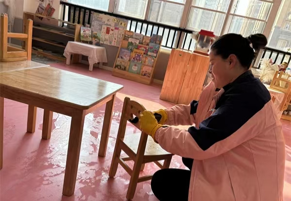 二、“净”待相逢,用心守护。为扎实做好新学期开学前卫生准备工作,给幼儿提供干净整洁的室内活动场地,各班老师对班级玩具、物品及地面门窗进行了擦洗,将活动室、盥洗室进行了全面的卫生消毒。在大家的细致清洁下,窗台的边角、玩具柜的缝隙,每个角落都变得干干净净!环境清扫消毒是幼儿身体健康的基础保障,为了给幼儿提供一个安全卫生与美丽舒适的环境,后勤工作人员对户外的树枝进行修剪及无死角的全面清洁。食堂工作人员对餐具、厨具、消毒用具、地面等进行全面清洁、消毒。设施设备进行了调试工作,严把“入口”这一关的各项安全工作,杜绝一切食品安全隐患发生。