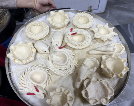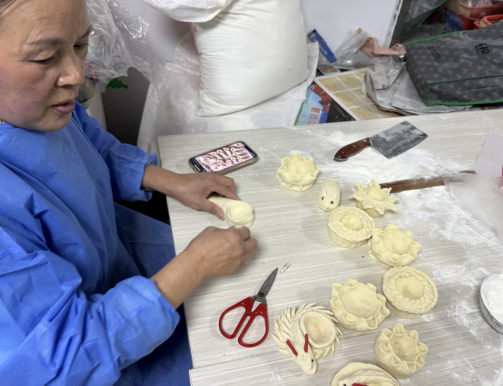 蒸面灯区域同样热闹非凡,这一传统习俗在社区里焕发出新的活力。长辈们一边示范,一边讲述着面灯背后的故事,年轻一代认真学习,揉面、塑形、点烛,小小的面灯在手中诞生,传递着对美好生活的祝愿。